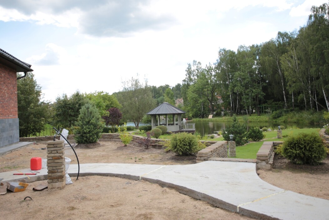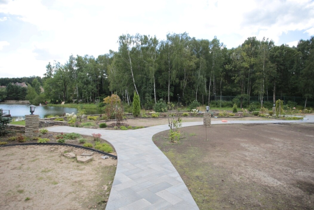 В перепланировке внутренней части сада было решено несколько задач. С одной стороны было оставлено достаточно много открытого пространства для созерцания прекрасного окружающего пейзажа. С другой, в определенных местах были высажены крупные растения для создания комфорта и уюта закрытого пространства: ажурные многоштамбовые кусты ирги канадской, рябины «Додонг», сосны обыкновенные «Тип Норвегия» и аллея из яблонь «Эверест». Через несколько лет они создадут прекрасные декоративные объемы. Их дополняют горные сосны, спиреи, гортензии, ивы «Маяк» и можжевельники.