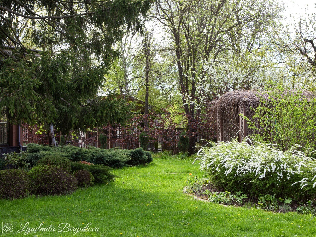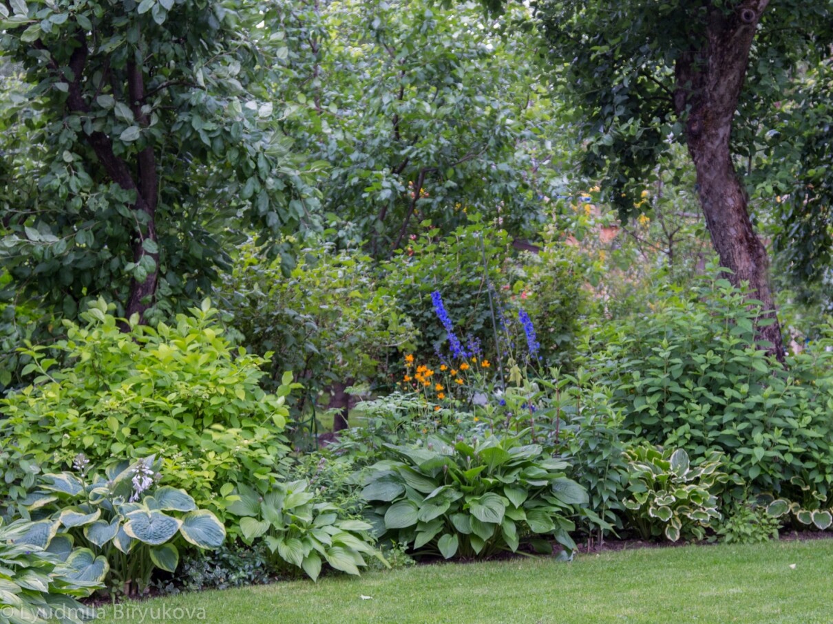 Этот сад, расположенный в стародачном поселке, создавался на участке с уже взрослыми лесными и плодовыми деревьями. Это было заброшенное и заросшее бурьяном место. В начале его освоения больные и недекоративные деревья и кустарники были удалены, а оставшиеся стали каркасом нового сада...