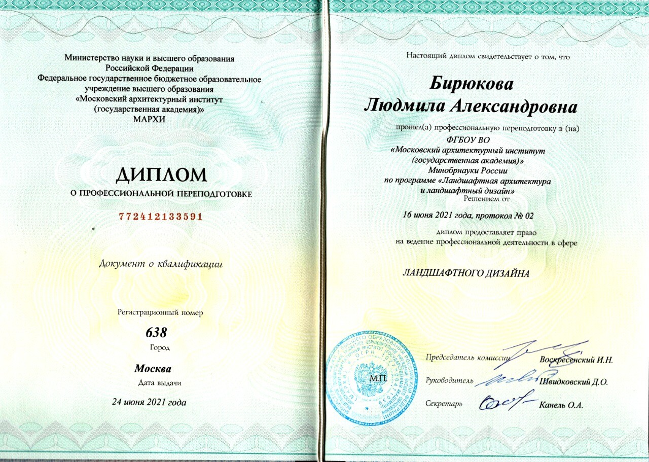 Высшая Школа Ландшафтной Архитектуры и Дизайна Московского Архитектурного Института (Государственной Академии) МАРХИ, диплом с отличием.