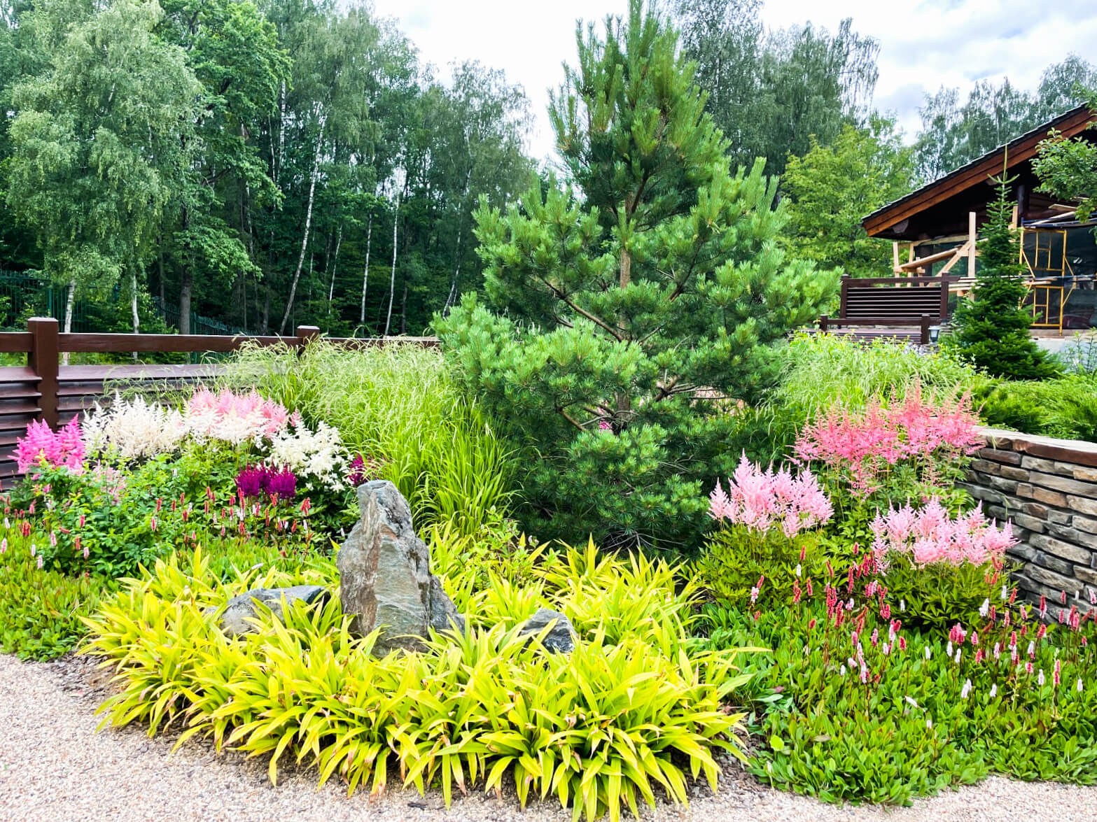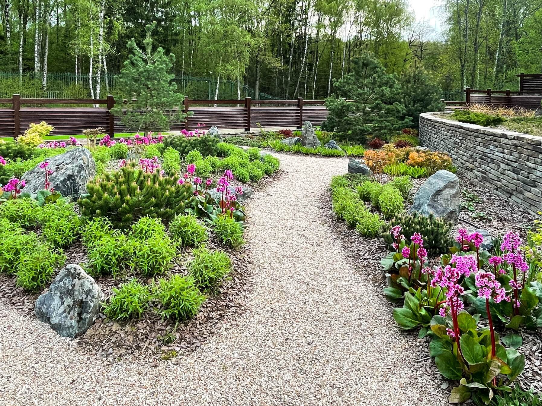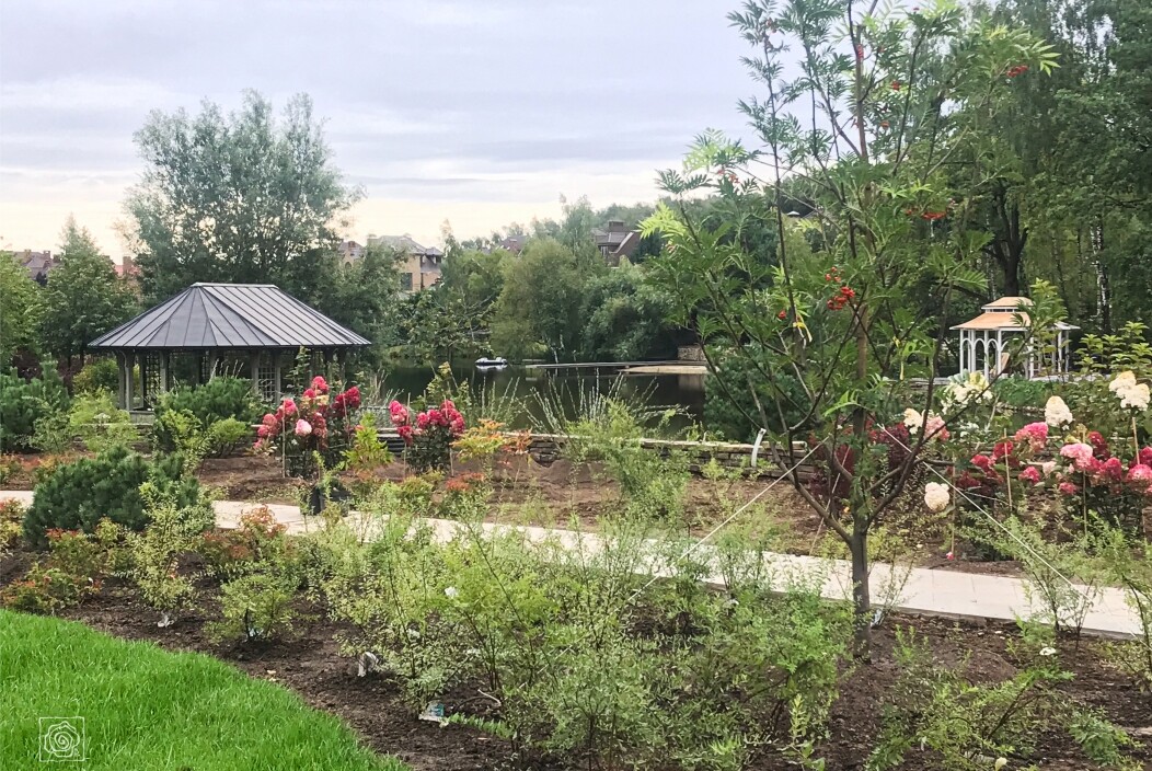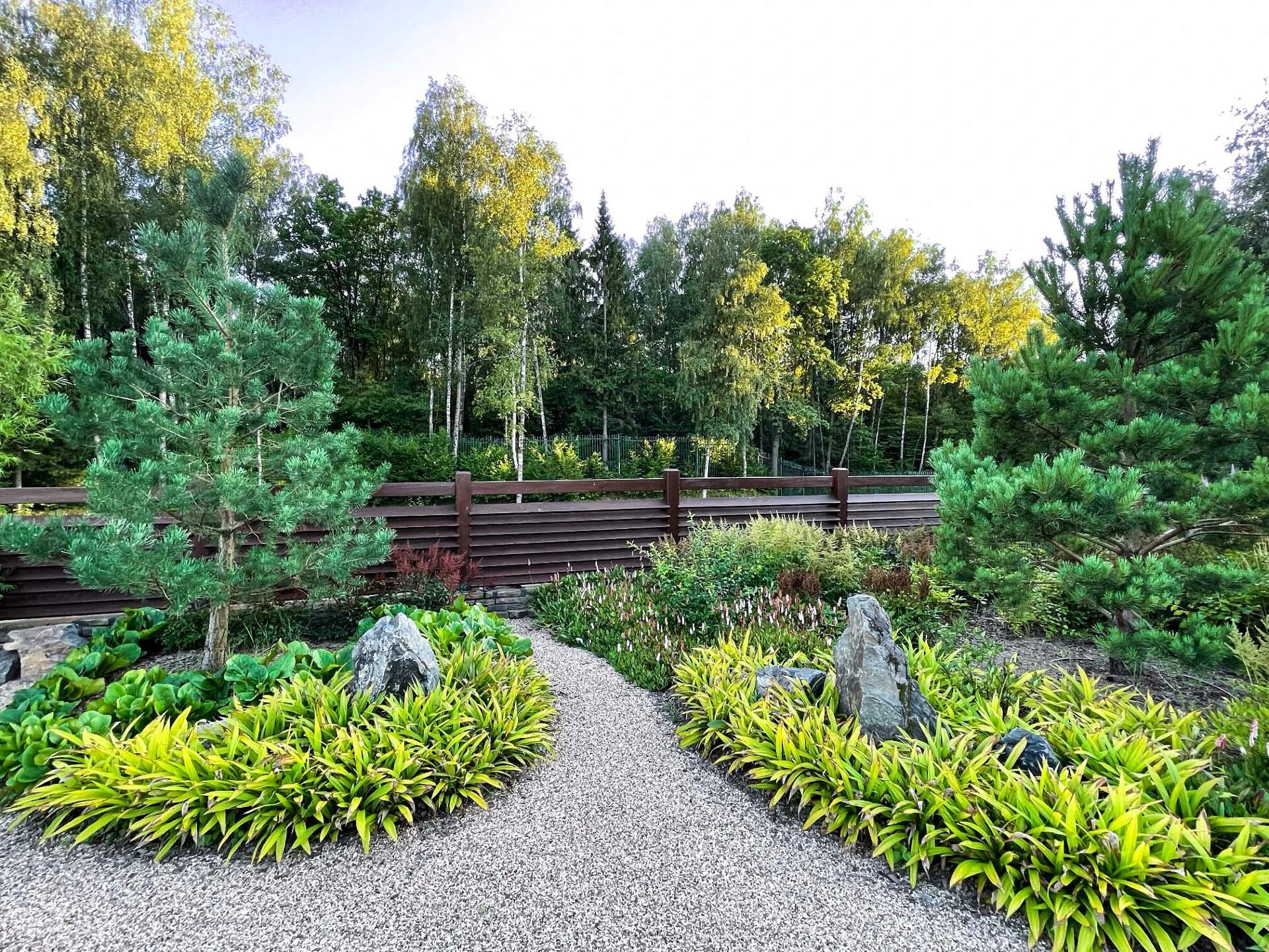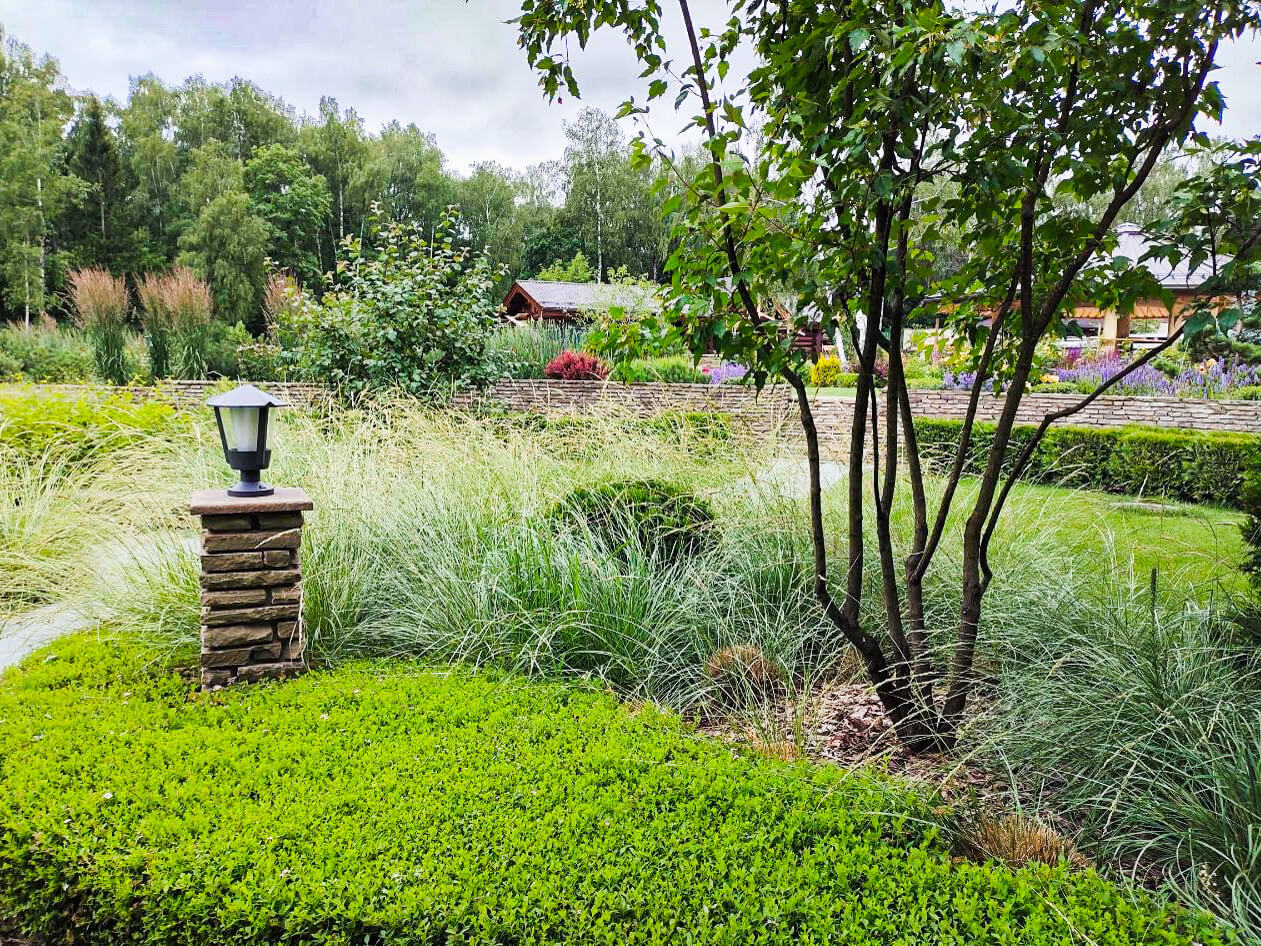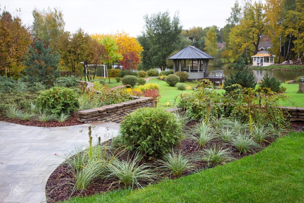 В перепланировке внутренней части сада было решено несколько задач. С одной стороны было оставлено достаточно много открытого пространства для созерцания прекрасного окружающего пейзажа. С другой, в определенных местах были высажены крупные растения для создания комфорта и уюта закрытого пространства: ажурные многоштамбовые кусты ирги канадской, рябины «Додонг», сосны обыкновенные «Тип Норвегия» и аллея из яблонь «Эверест». Через несколько лет они создадут прекрасные декоративные объемы. Их дополняют горные сосны, спиреи, гортензии, ивы «Маяк» и можжевельники.
