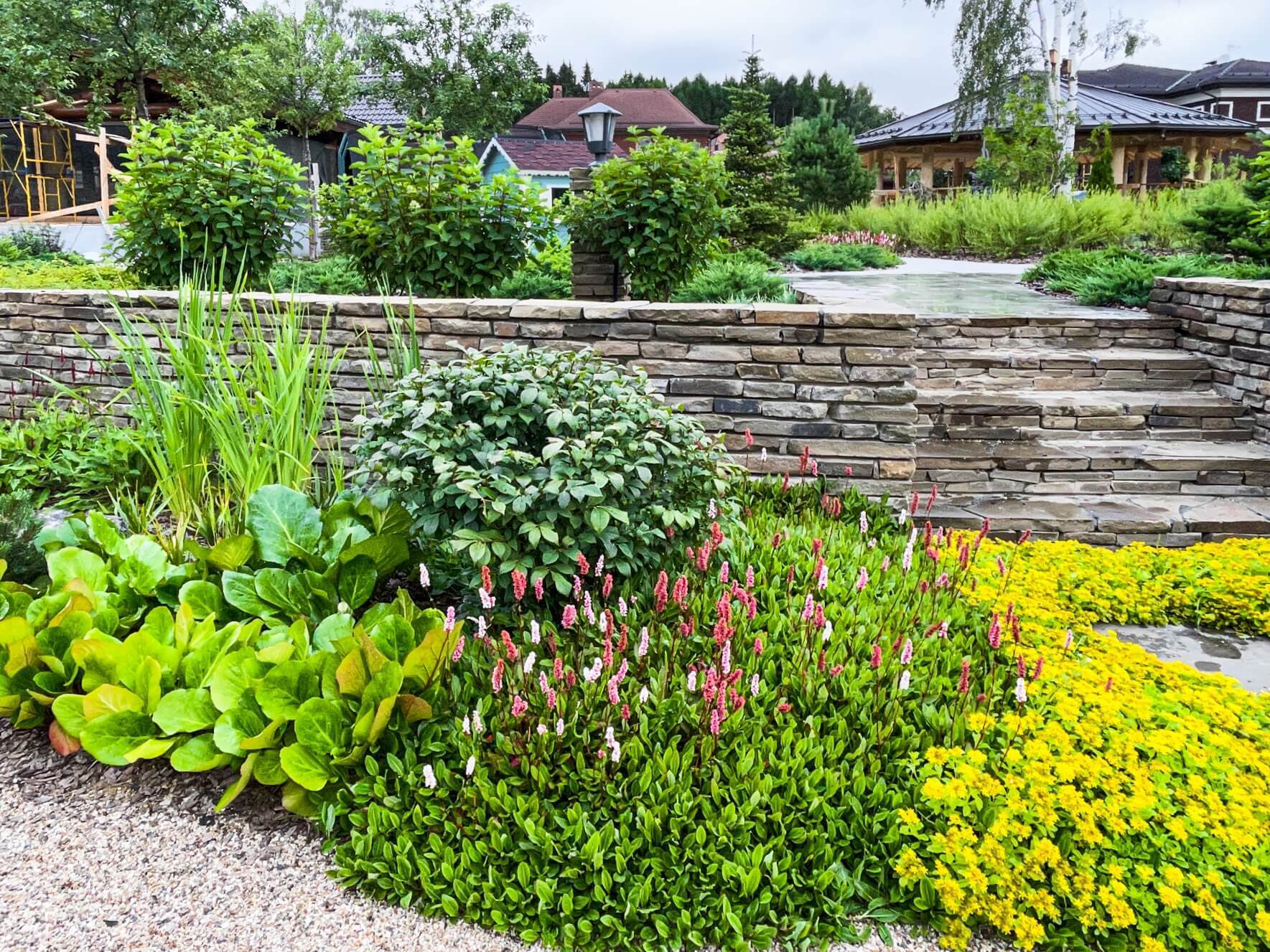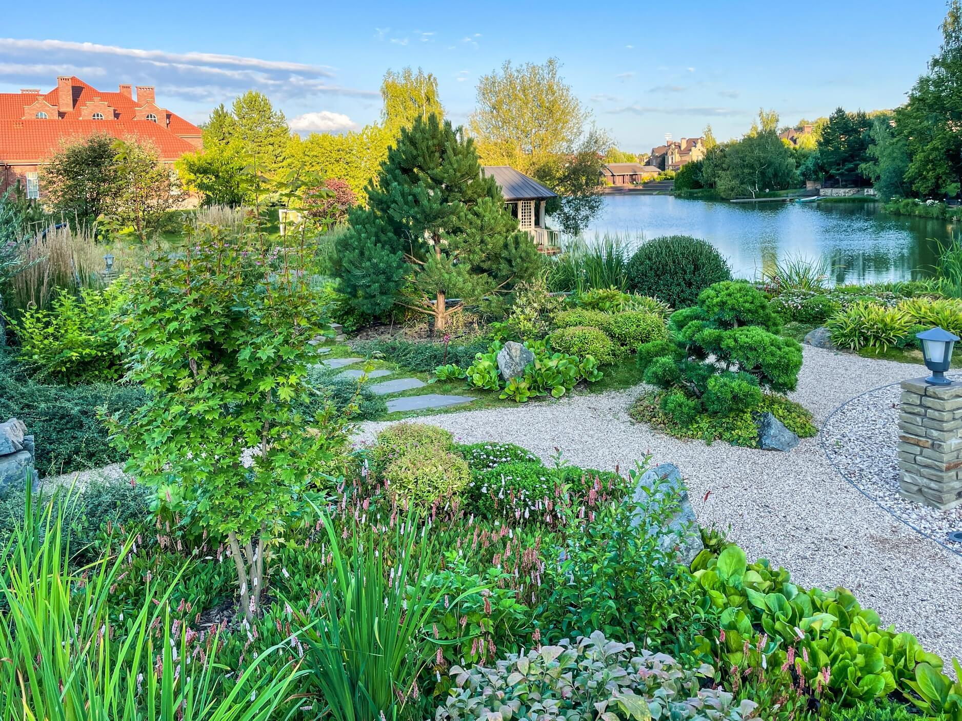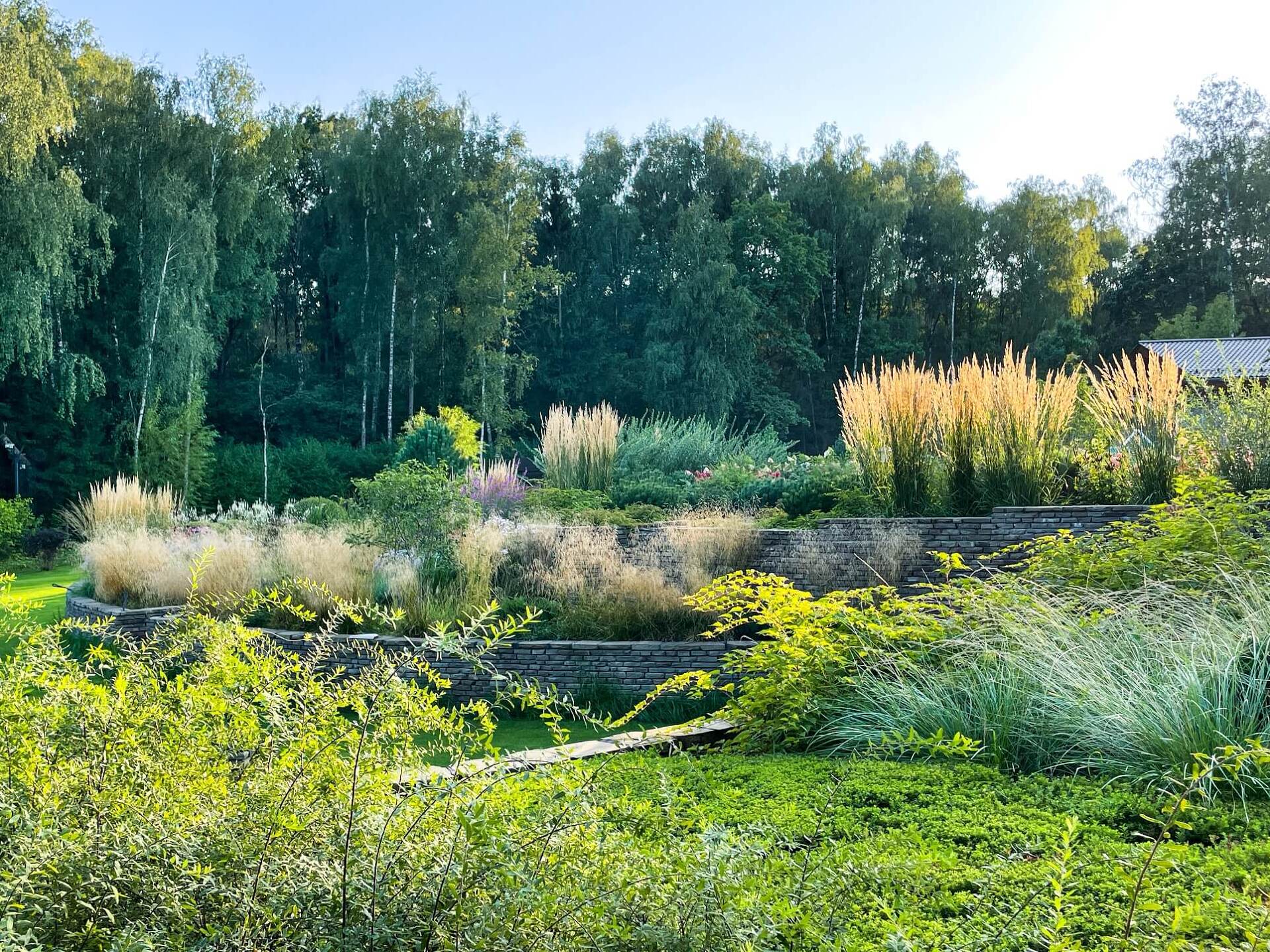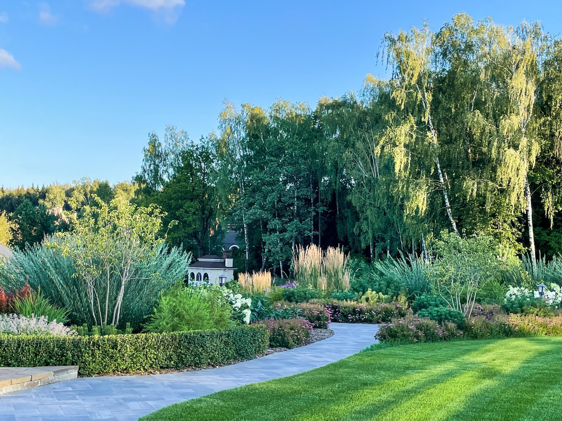 В перепланировке внутренней части сада было решено несколько задач. С одной стороны было оставлено достаточно много открытого пространства для созерцания прекрасного окружающего пейзажа. С другой, в определенных местах были высажены крупные растения для создания комфорта и уюта закрытого пространства: ажурные многоштамбовые кусты ирги канадской, рябины «Додонг», сосны обыкновенные «Тип Норвегия» и аллея из яблонь «Эверест». Через несколько лет они создадут прекрасные декоративные объемы. Их дополняют горные сосны, спиреи, гортензии, ивы «Маяк» и можжевельники.