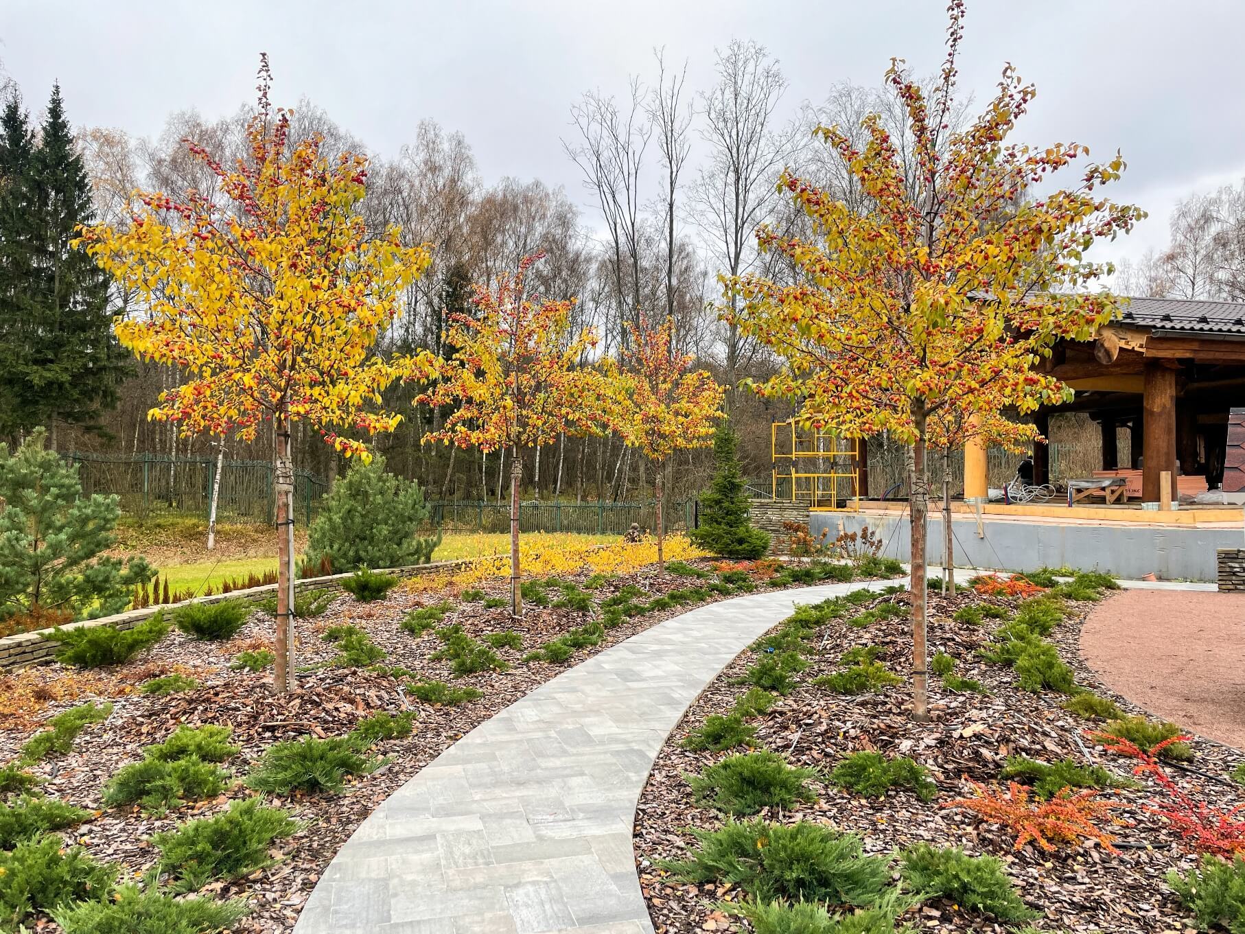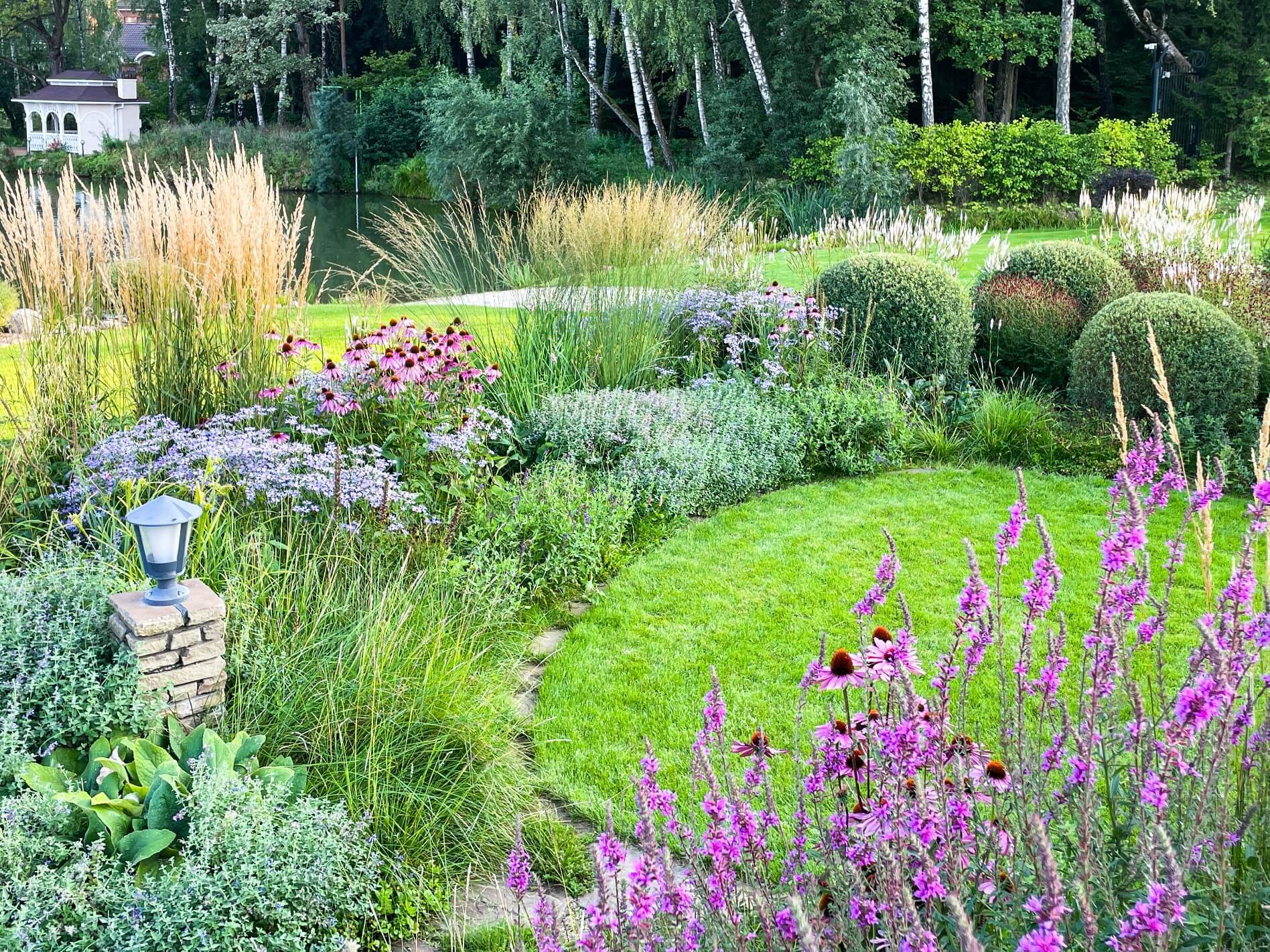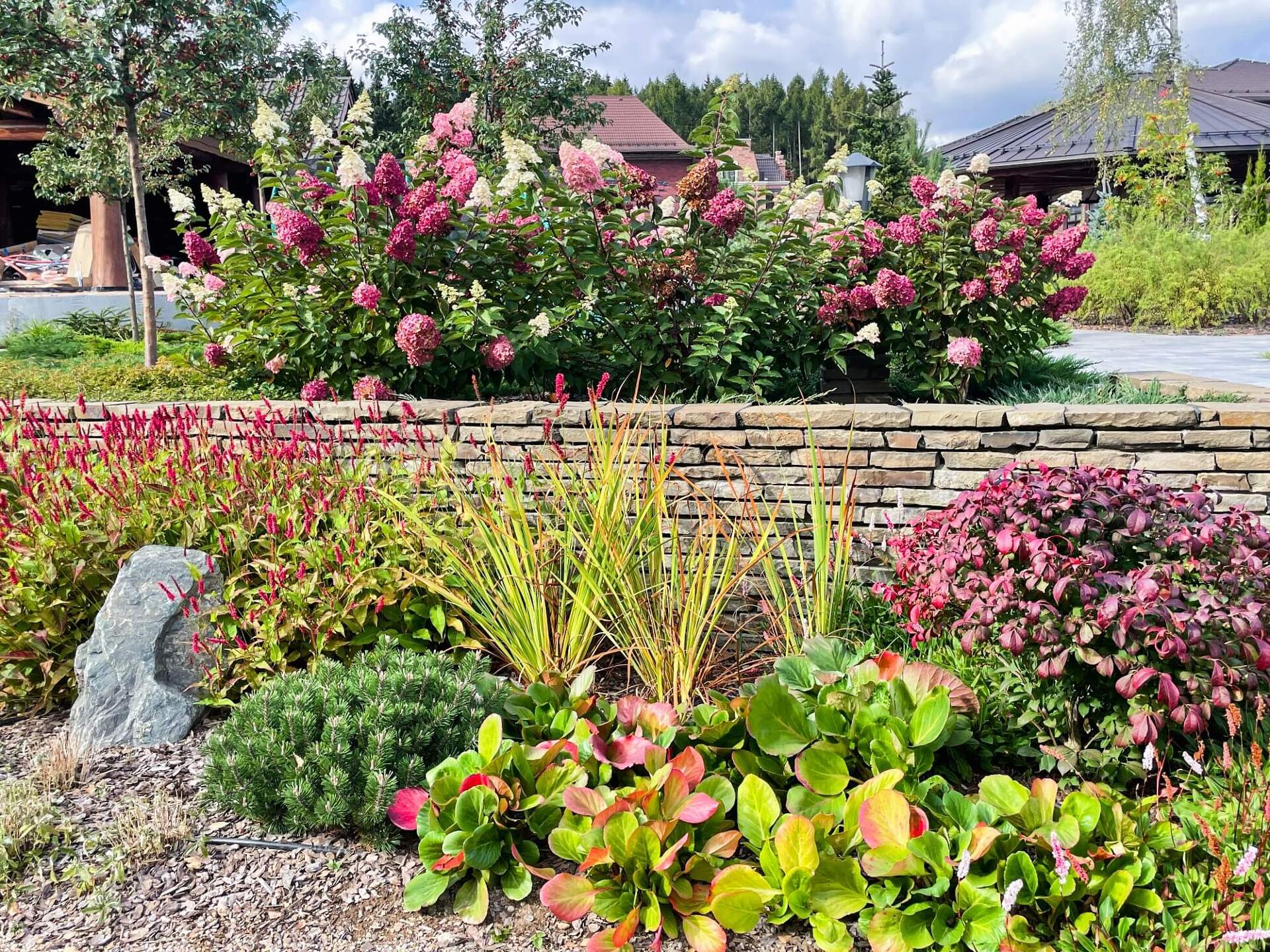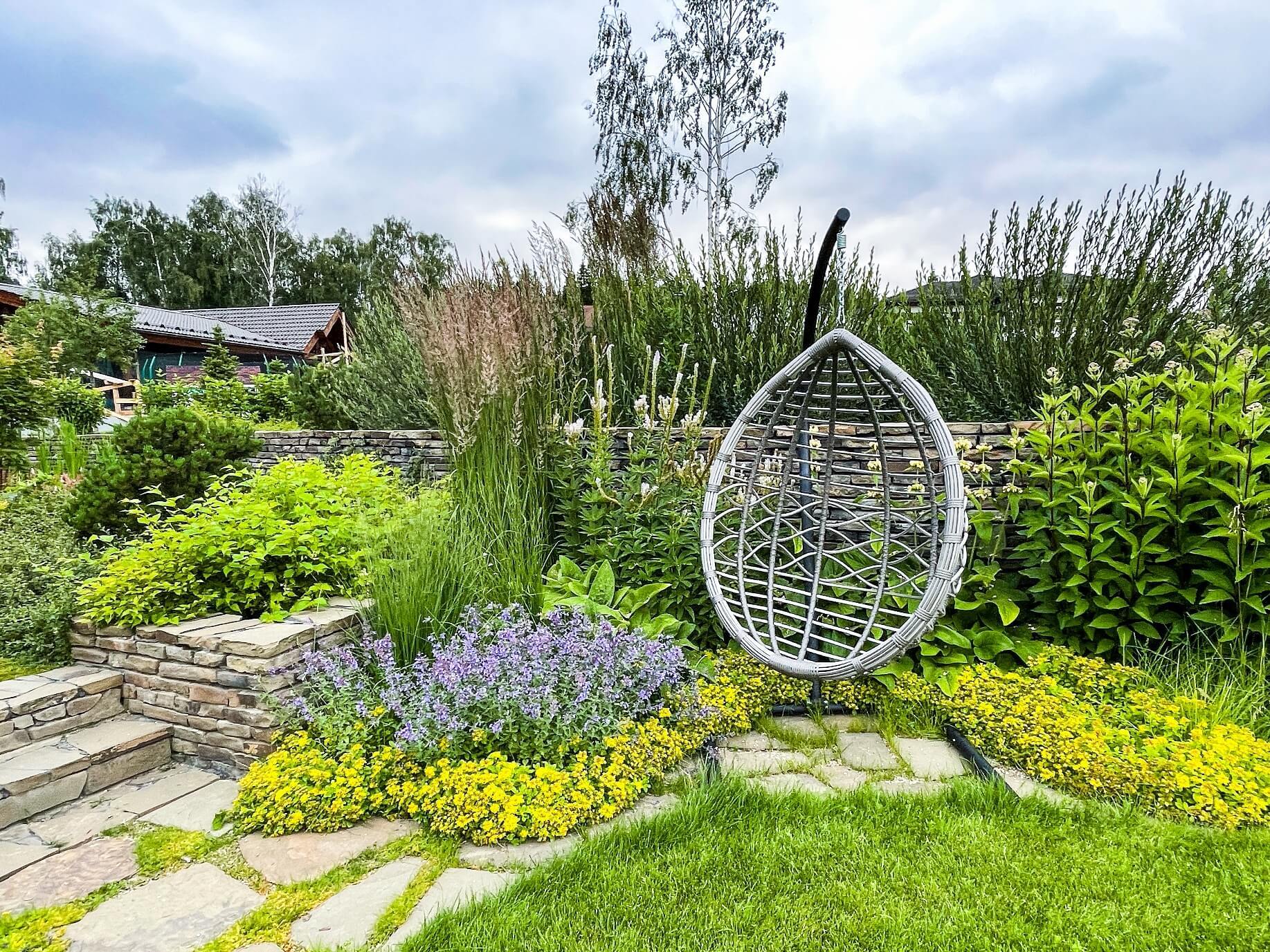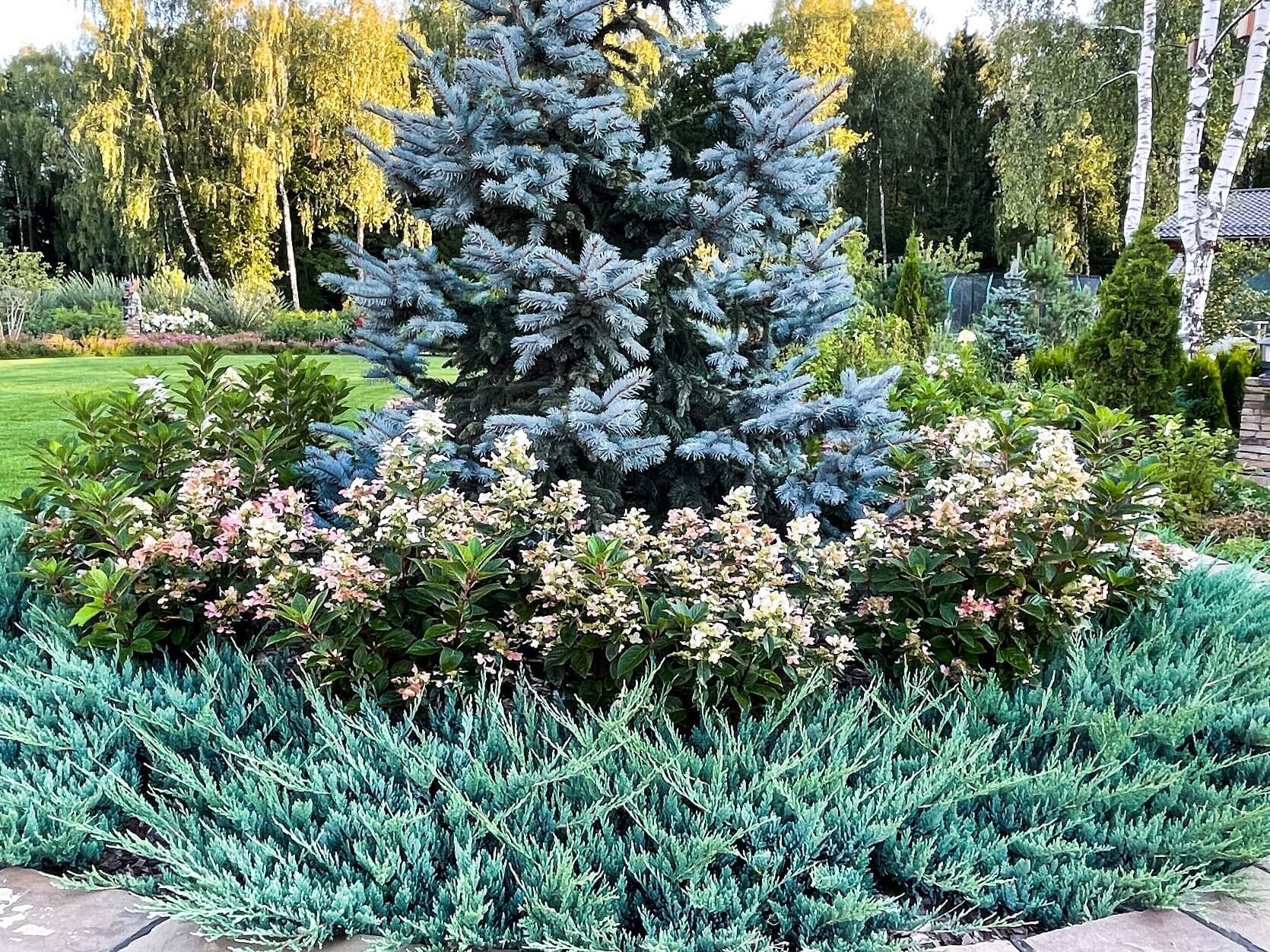 В перепланировке внутренней части сада было решено несколько задач. С одной стороны было оставлено достаточно много открытого пространства для созерцания прекрасного окружающего пейзажа. С другой, в определенных местах были высажены крупные растения для создания комфорта и уюта закрытого пространства: ажурные многоштамбовые кусты ирги канадской, рябины «Додонг», сосны обыкновенные «Тип Норвегия» и аллея из яблонь «Эверест». Через несколько лет они создадут прекрасные декоративные объемы. Их дополняют горные сосны, спиреи, гортензии, ивы «Маяк» и можжевельники.