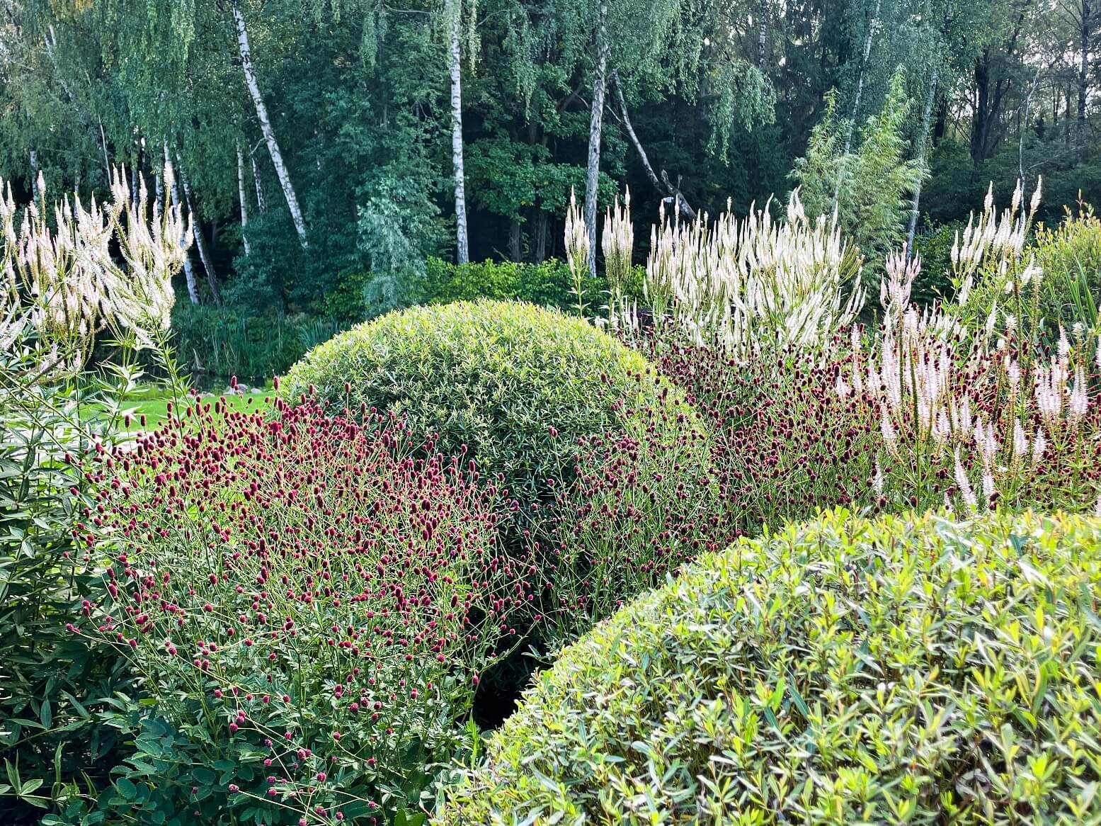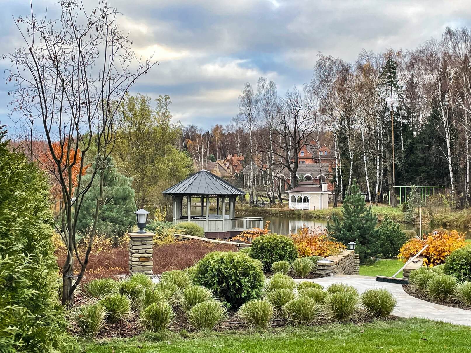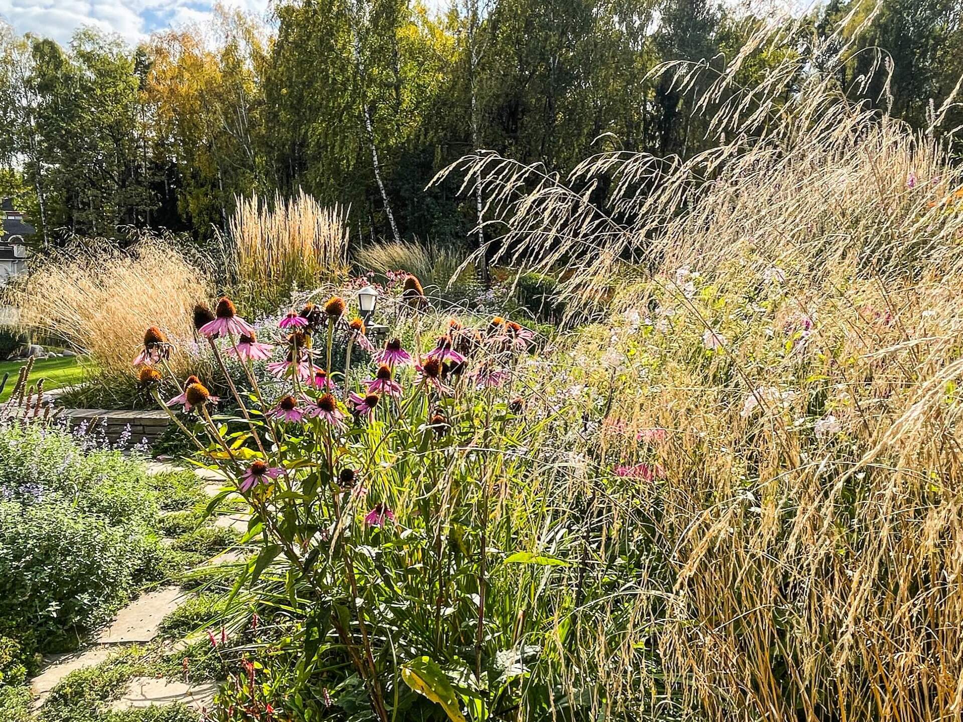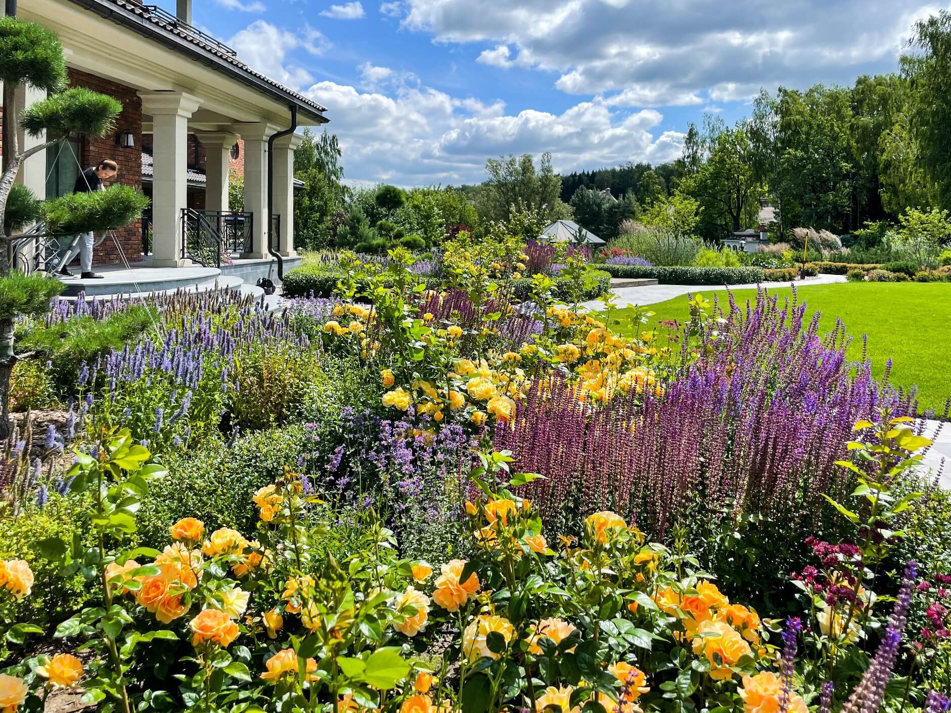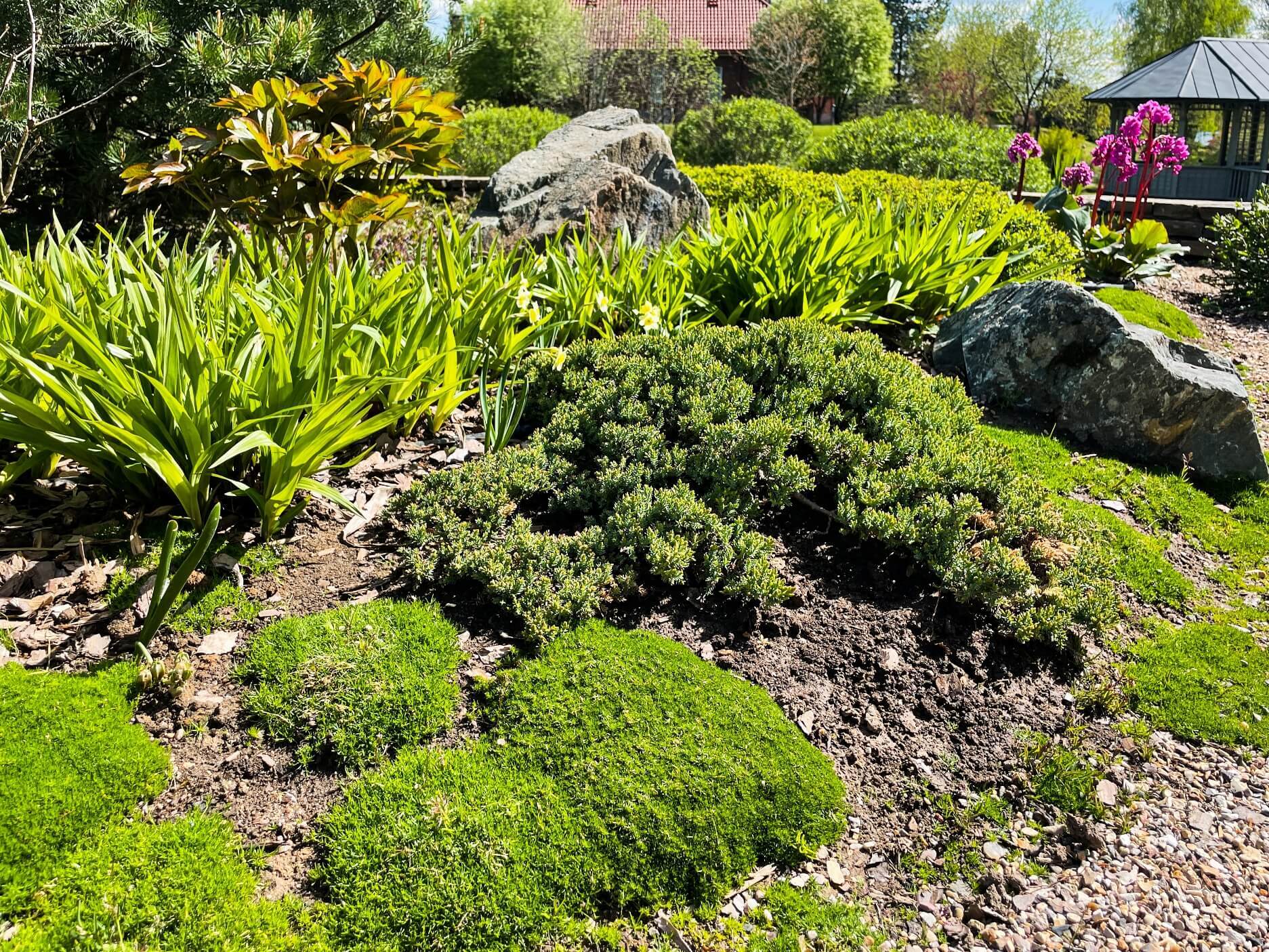 В перепланировке внутренней части сада было решено несколько задач. С одной стороны было оставлено достаточно много открытого пространства для созерцания прекрасного окружающего пейзажа. С другой, в определенных местах были высажены крупные растения для создания комфорта и уюта закрытого пространства: ажурные многоштамбовые кусты ирги канадской, рябины «Додонг», сосны обыкновенные «Тип Норвегия» и аллея из яблонь «Эверест». Через несколько лет они создадут прекрасные декоративные объемы. Их дополняют горные сосны, спиреи, гортензии, ивы «Маяк» и можжевельники.