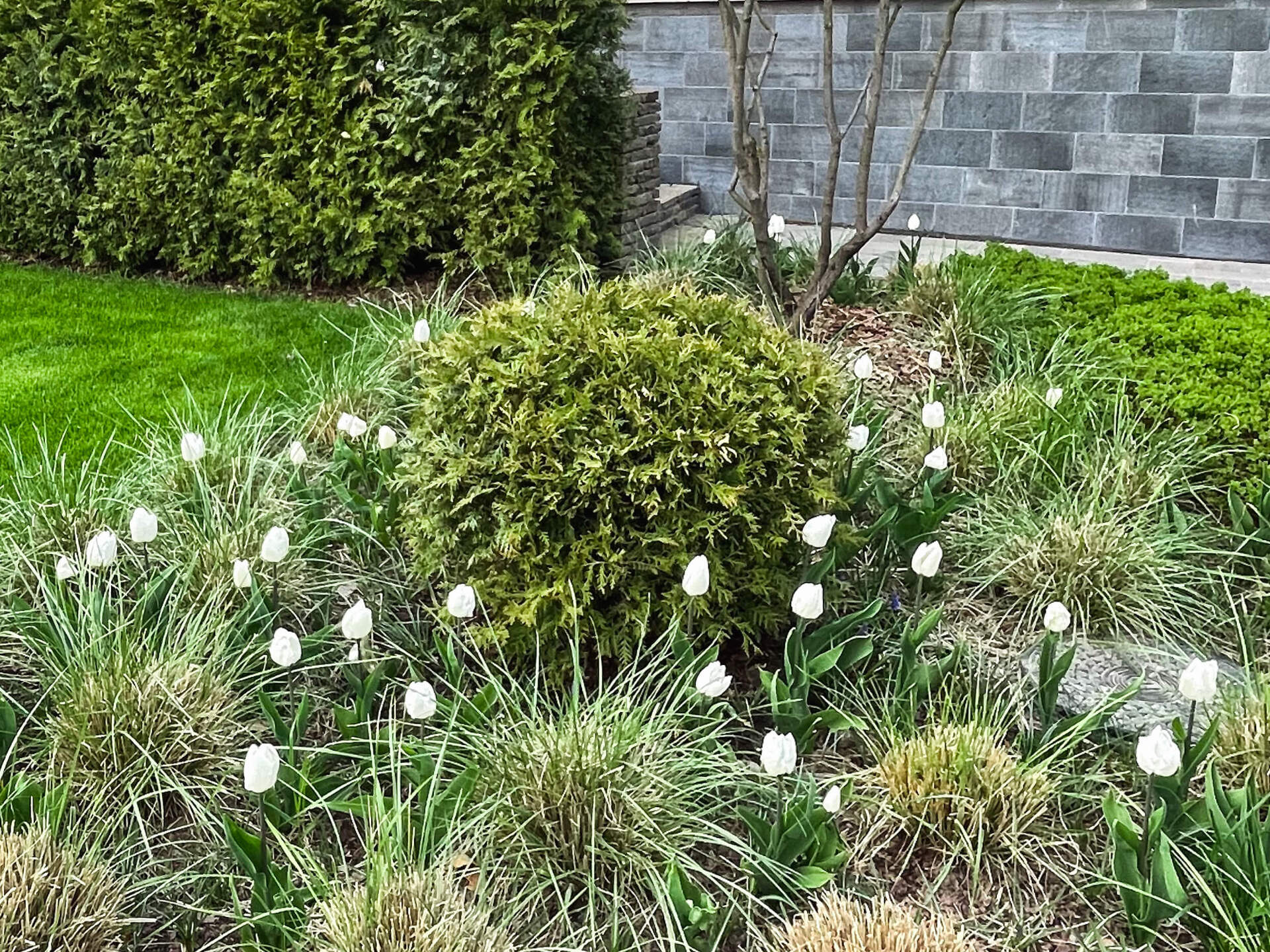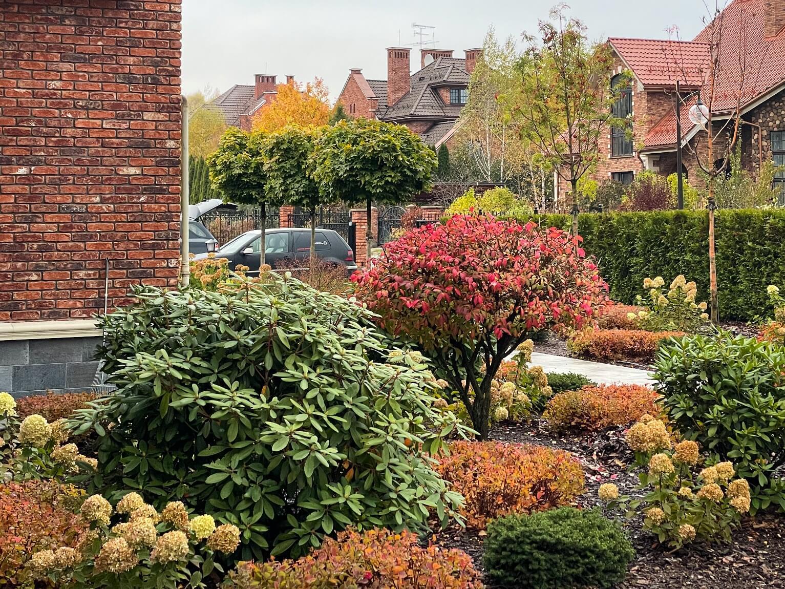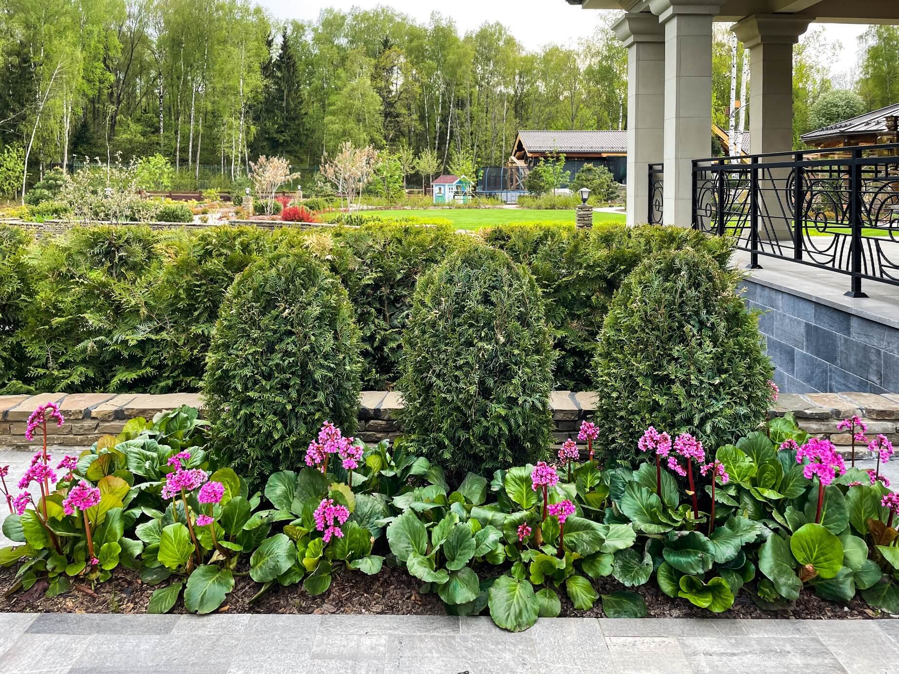 Растения парадной зоны призваны подчеркнуть ее торжественность, солидность и основательность. Все выдержано и стабильно декоративно - ничего лишнего. Колористически цветущие кустарники гармонируют с расцветкой отделки дома. В дальнейшем общий вид этой зоны дополнят многолетники, малые архитектурные формы и ландшафтное освещение.