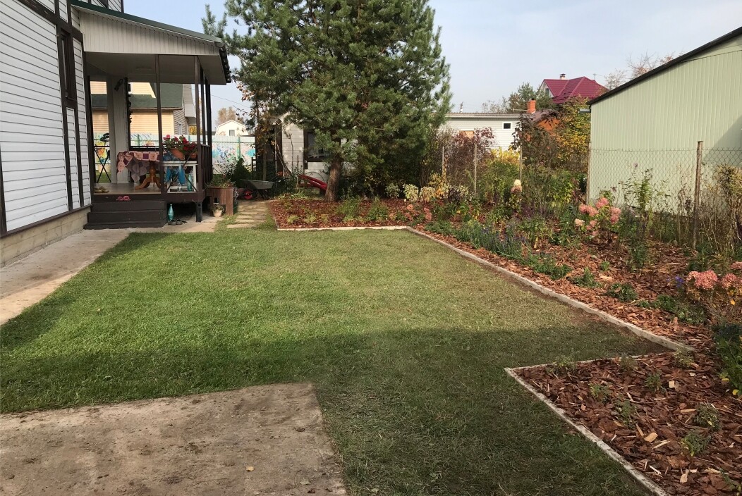 Перед началом работ был разработан экспресс-эскиз и подобран подходящий посадочный материал. В соответствии с новым проектом мы изменили форму миксбордера и сделали основательную подсыпку ложа цветника. Также было запроектировано функциональное и декоративное пошаговое мощение из имеющихся у заказчиков плит. Эту работу хозяева планировали сделать уже своими силами.
