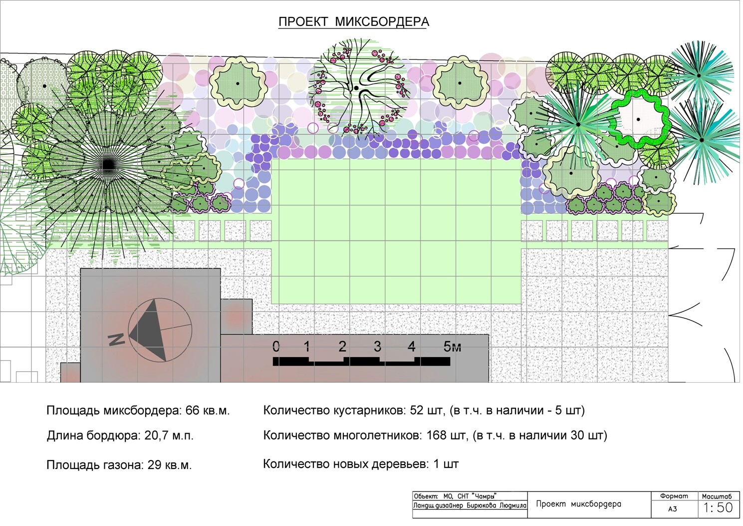 Представленные фотографии сделаны сразу после посадки и пока не дают понимания вида миксбордера в расцвете своей декоративности. Но использование в ассортименте декоративной яблони, метельчатых гортензий, массивов дёрена «Элегантиссима» и таких структурных многолетников как посконники, вероникаструмы, вербейники, вейники и флоксов говорят сами за себя. А присутствие шалфеев, иссопа, котовника с фиолетово - голубыми цветками объединяет все посадки в любимой заказчицей цветовой гамме.
