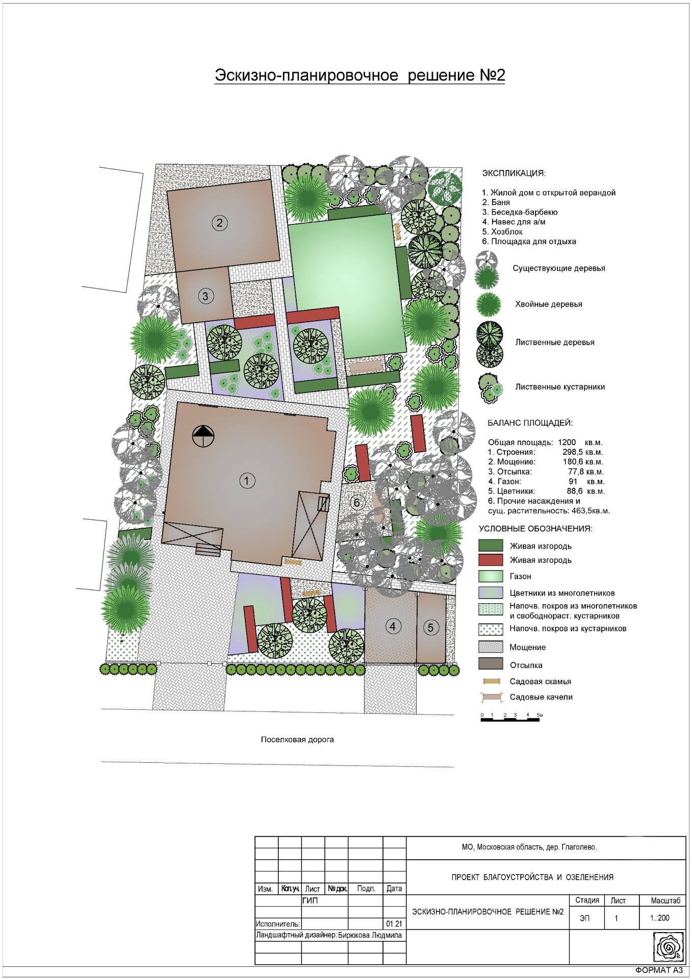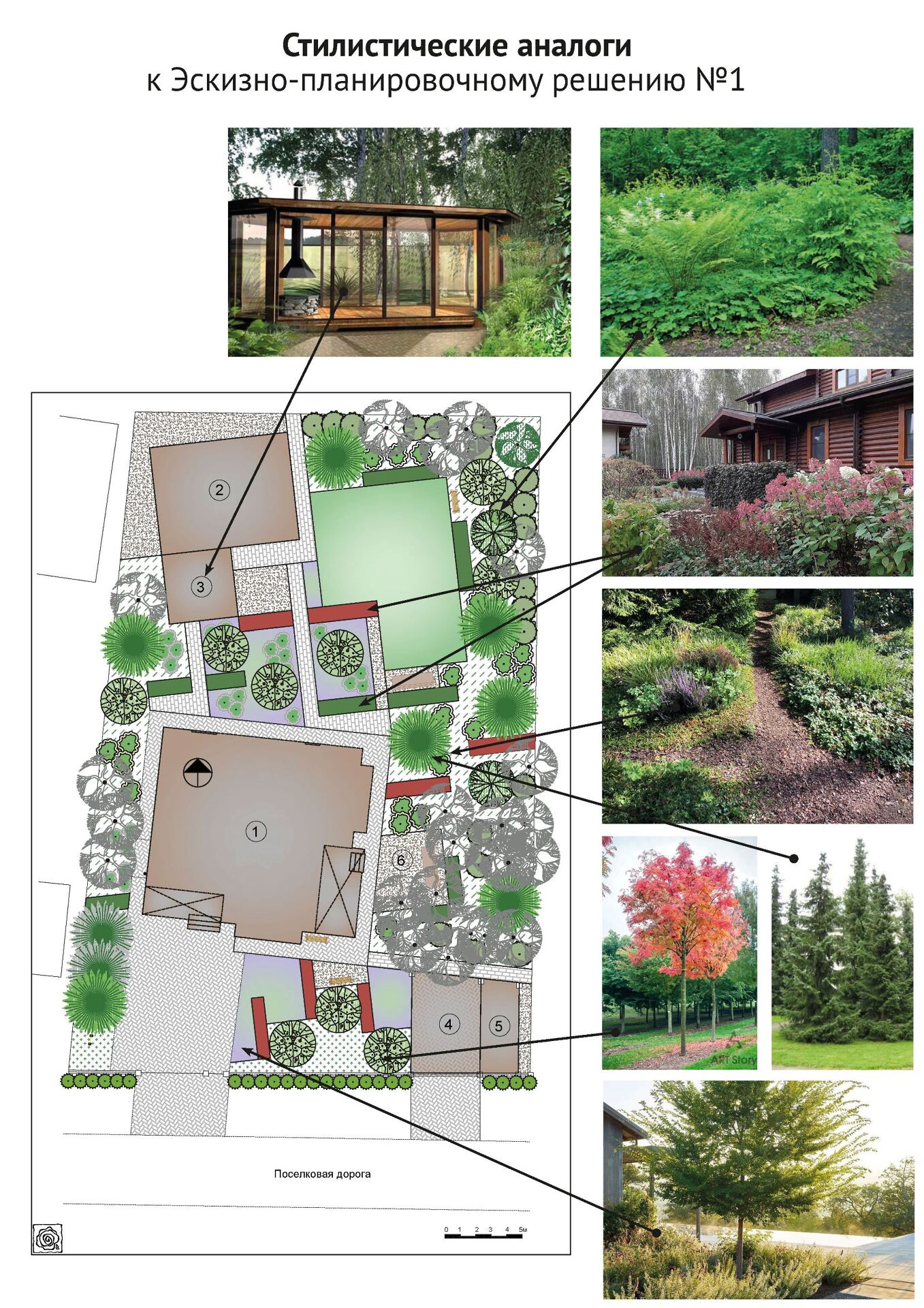 Основой планировочного решения стали динамичные линии, подчеркнутые не только дорожно-тропиночной сетью и расположением бани, но и посадками с их контрастным колористическим решением.