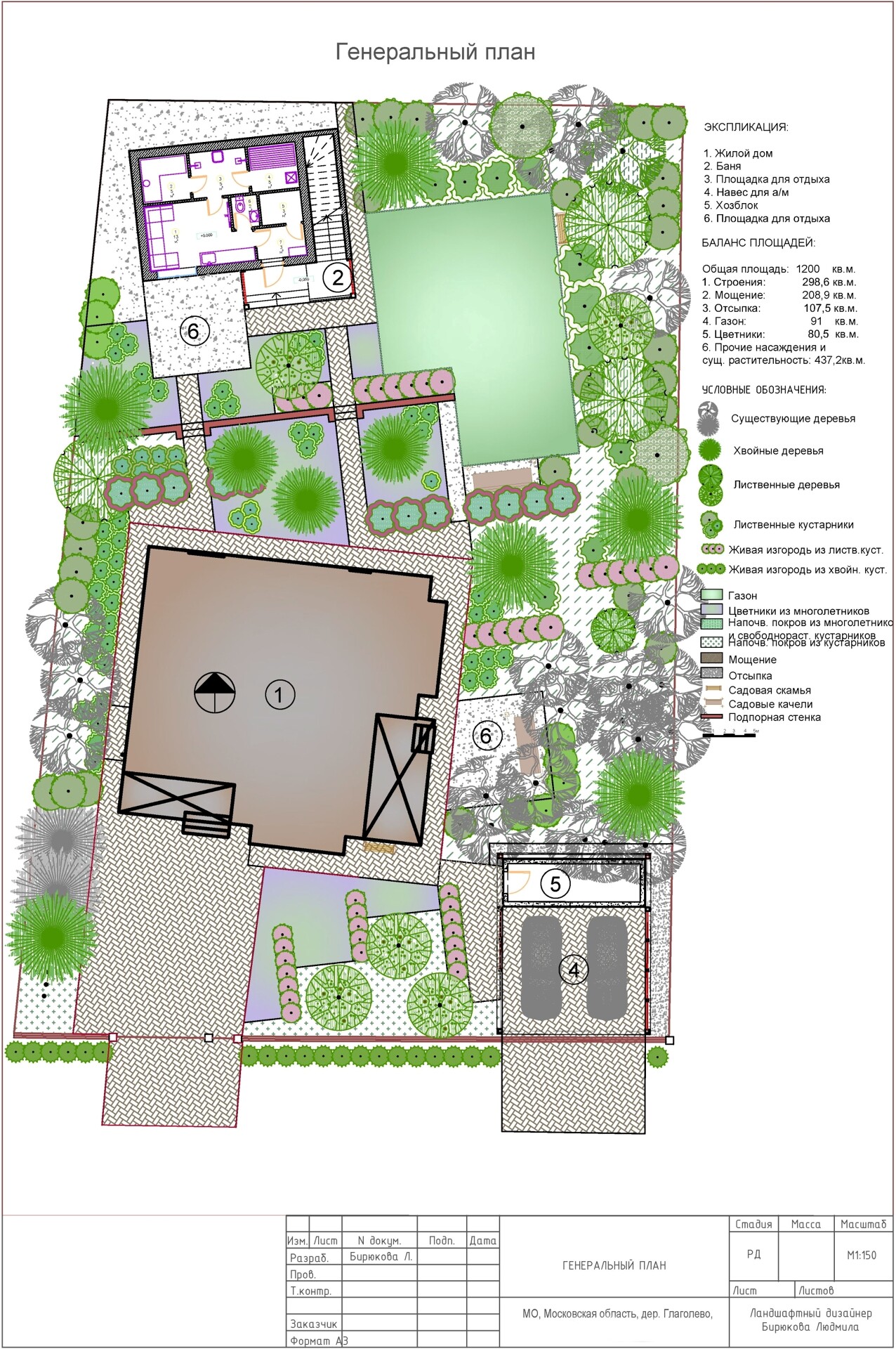 Хозяин этого сада - молодой человек, предпочитающий активный отдых, спорт и скорость. Его пожеланием было создать технологичный декоративный современный сад с минимальным уходом, с организацией зон отдыха для своей семьи, состоящей из 3 поколений. Также стояла задача размещения на Генеральном плане бани.