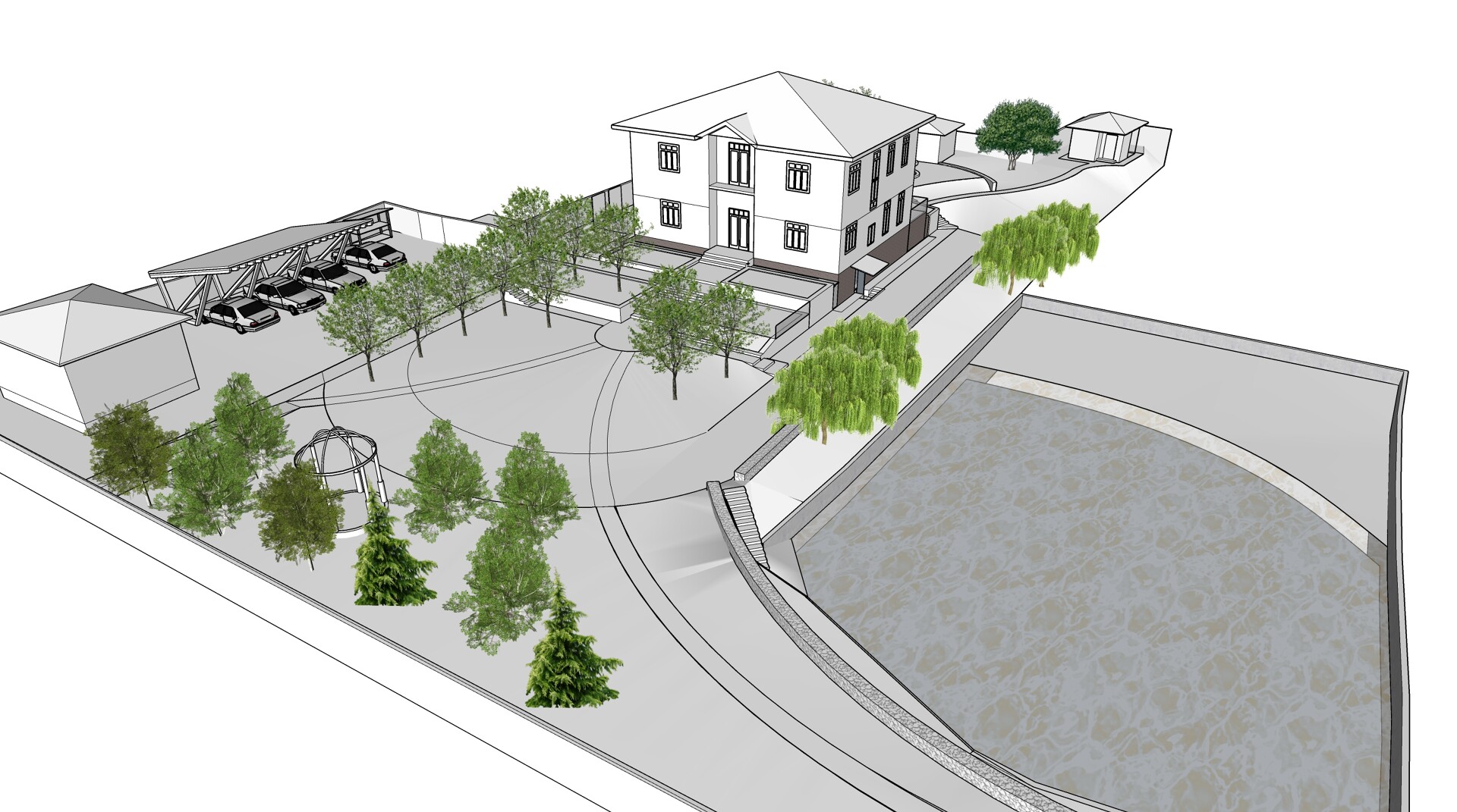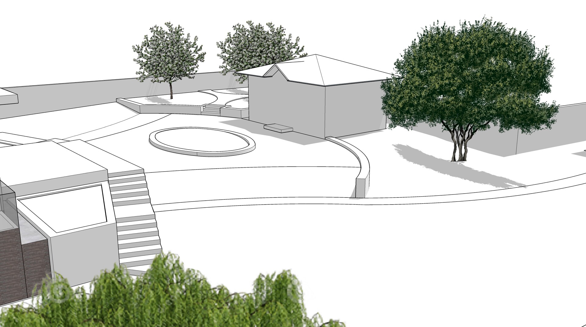 Ниже можно будет спуститься на мощеное патио в окружении оставшейся от «старого усадебного парка» липовой аллеи и по дорожке пройти через современные цветники к березовой роще с ротондой. Проект находится в процессе реализации.