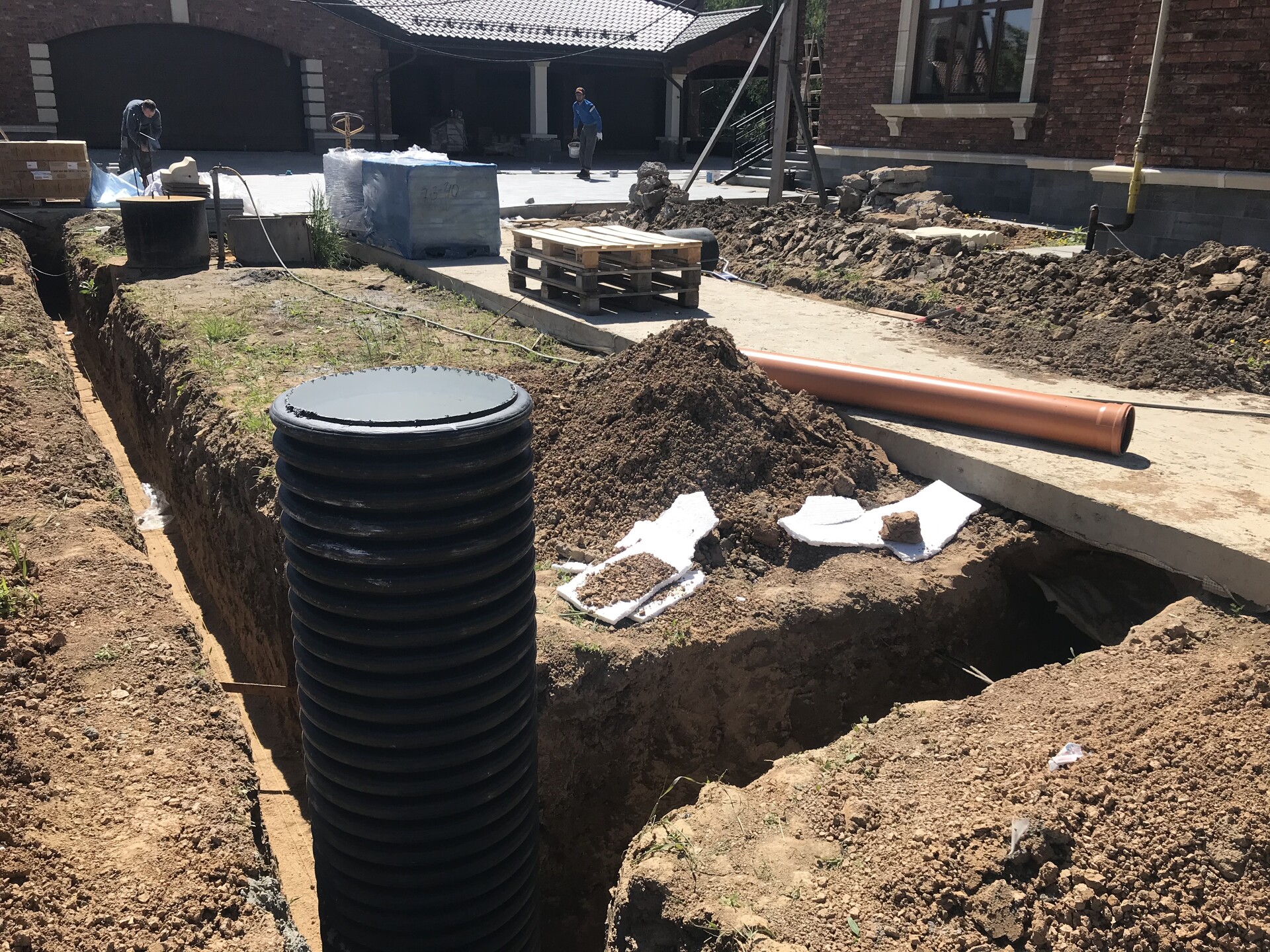 На основе разработанной проектной документации мы выполняем полный комплекс работ по прокладке дренажной и ливневой систем.