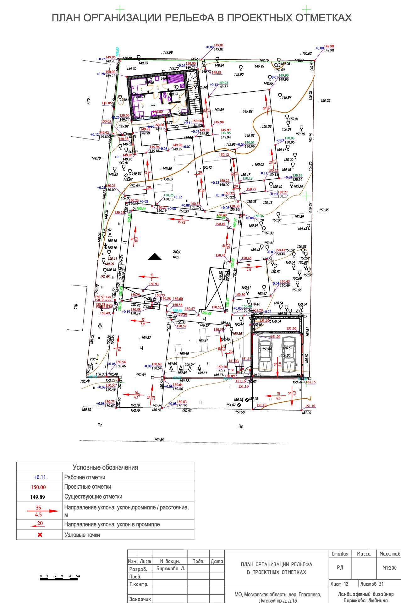 План организации рельефа в проектных отметках - Проект вертикальной планировки участка. По сути неотъемлемая часть любого проекта, тем более для участков с относительно ровным рельефом. Содержит в себе информацию о просчитанных с учетом существующих норм уклонах на площадках и дорожно-тропиночной сети, а также высотные отметки окружающей территории.