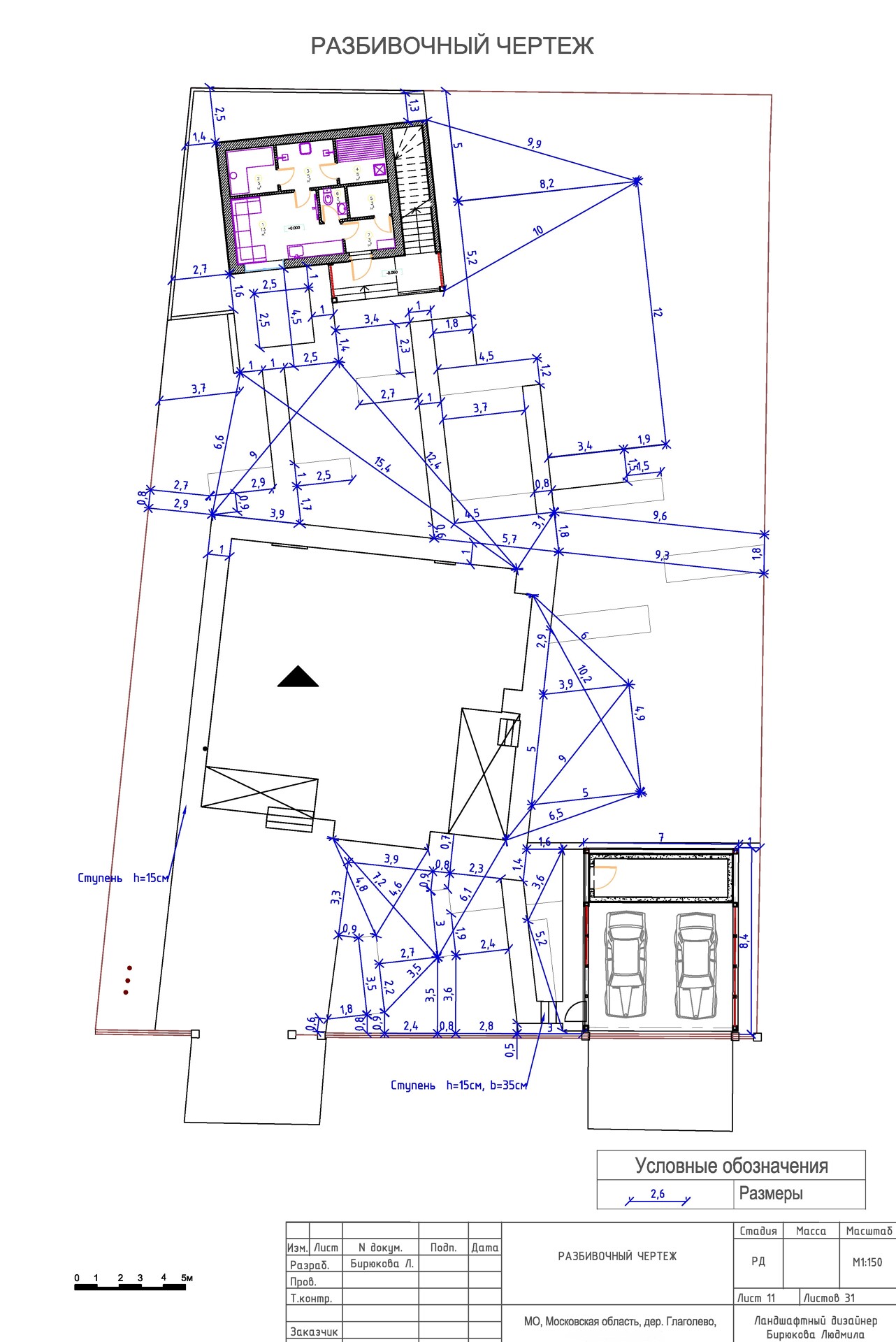 Разбивочный чертеж. Дает все необходимые размерные данные для выноса проектных линий и объектов на местность.