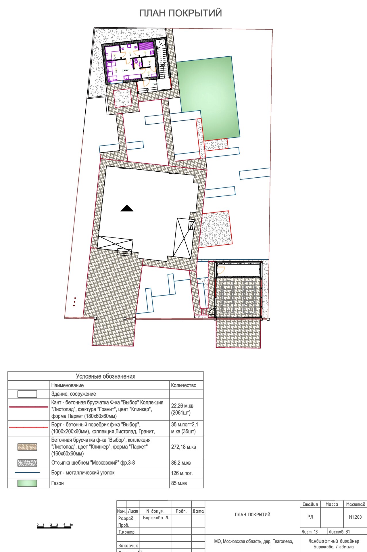 План покрытий с разрезами конструктивных слоев. Содержит в себе план мощения, объемы и типы используемых материалов для финишного покрытия, а также соответствующие типу грунтов на участке и строительным нормам и правилам разрезы конструктивных слоев.