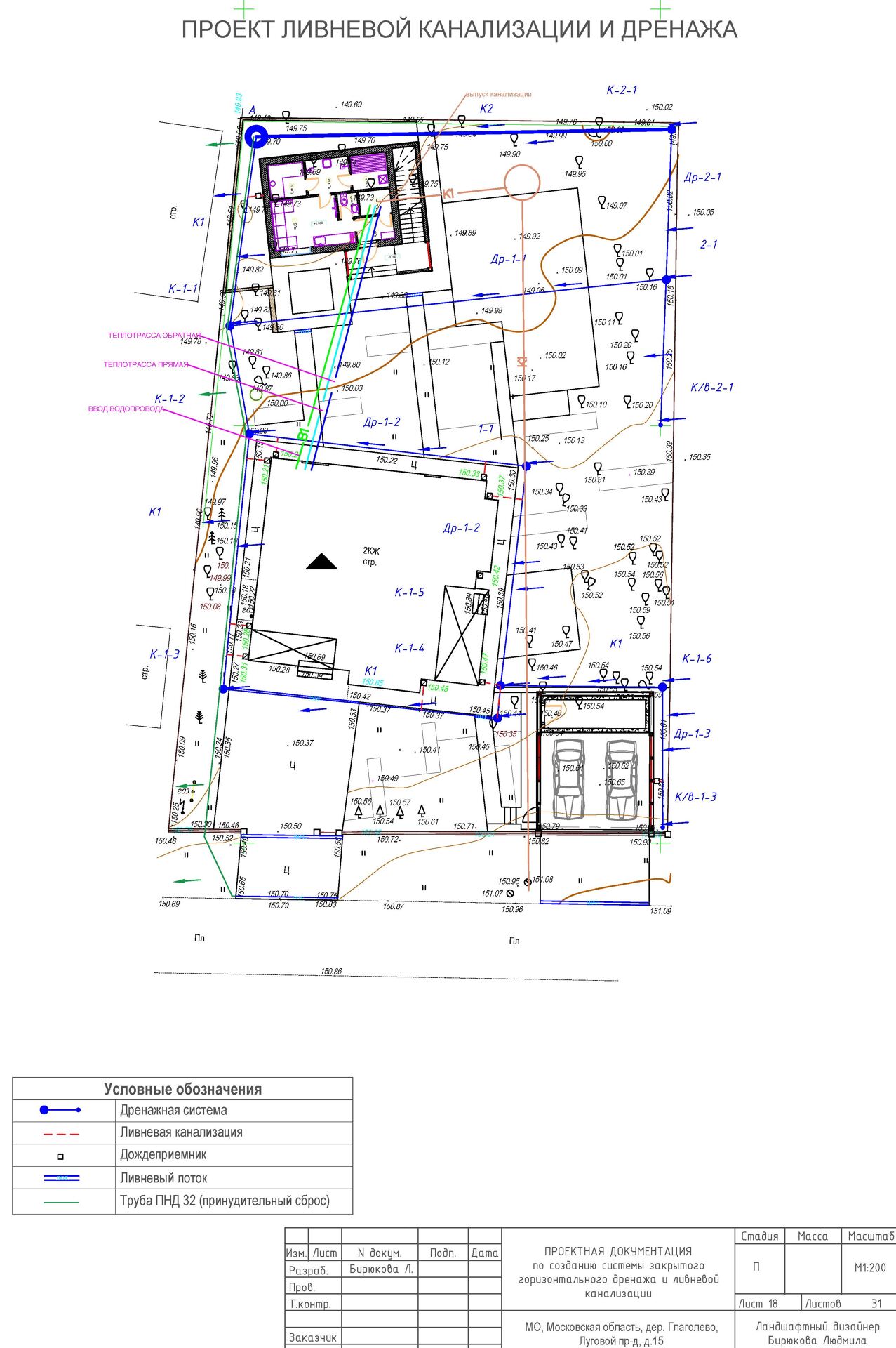 Проект ливневой и дренажной систем. Содержит в себе просчитанные чертежи расположения дренажной и ливневой систем с подробными разрезами и сводную ведомость объемов и материалов.