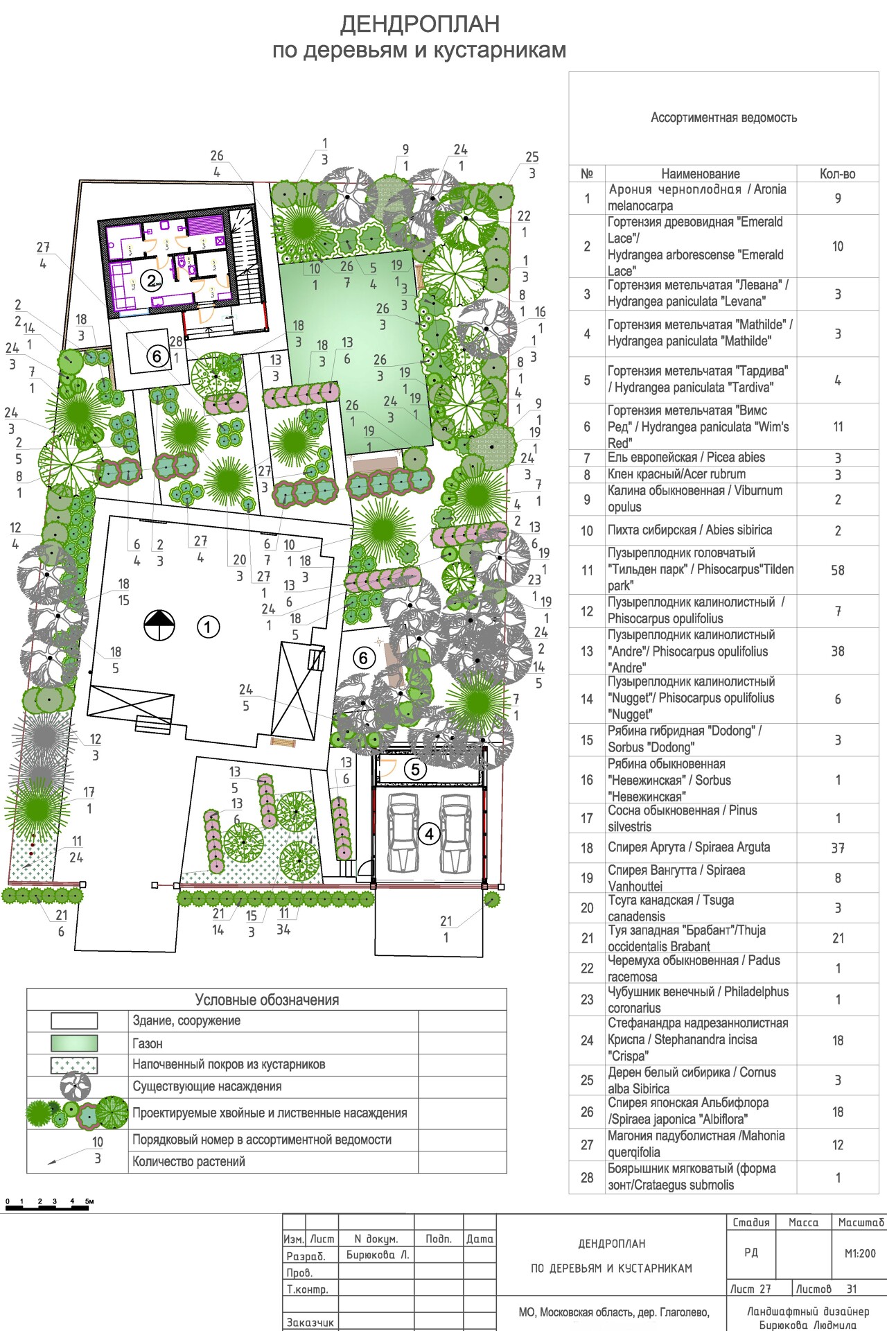 Дендроплан с ассортиментной ведомостью по деревьям и кустарникам.