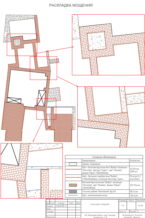Раскладка мощения. Использование различных типов мощения, сочетание разных способов укладки финишного покрытия или включение в мощение каких-либо декоративных вставок, украсит любой сад. Этот чертеж содержит в себе информацию о деталях мощения, стыковочных элементах и прочих нюансах.