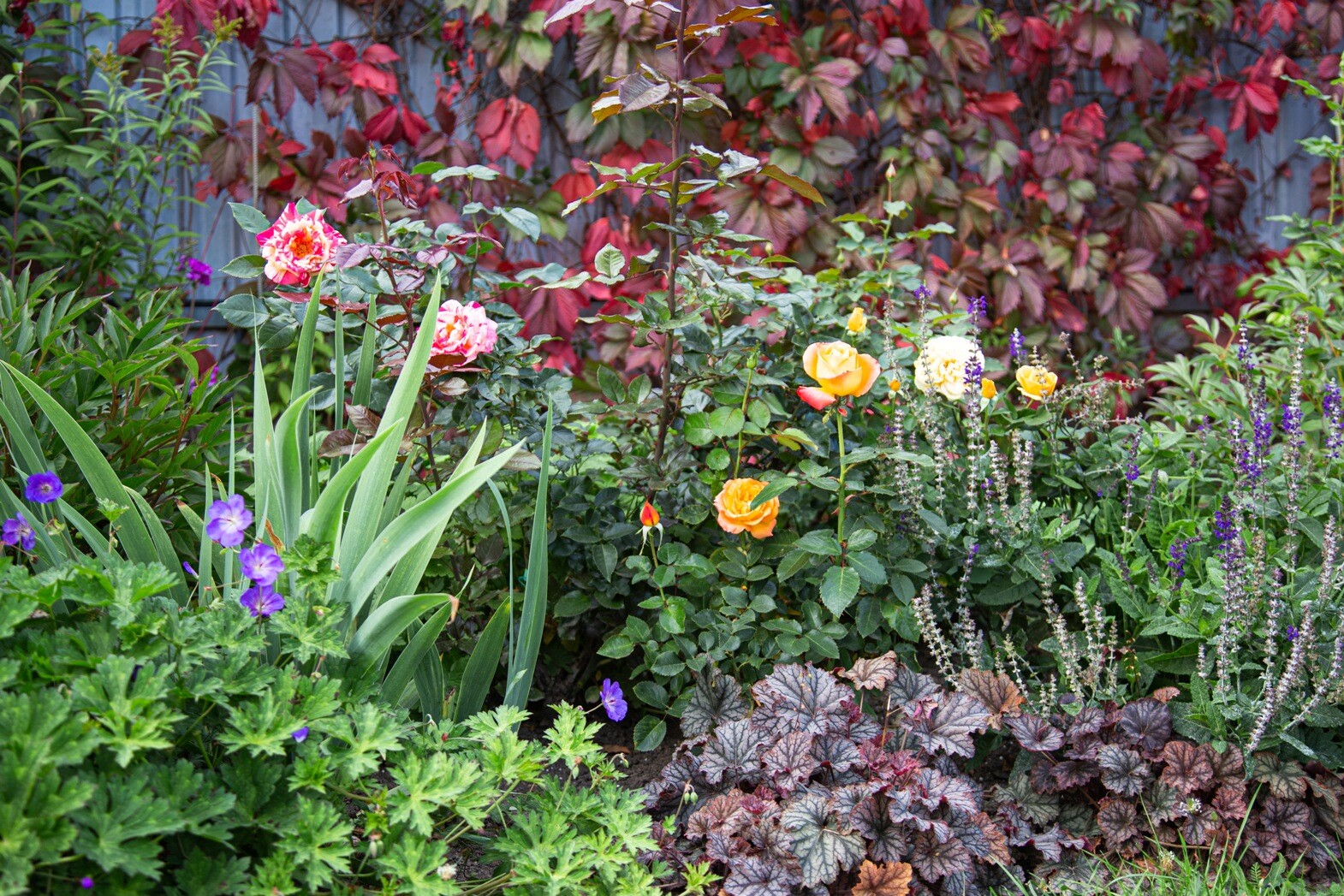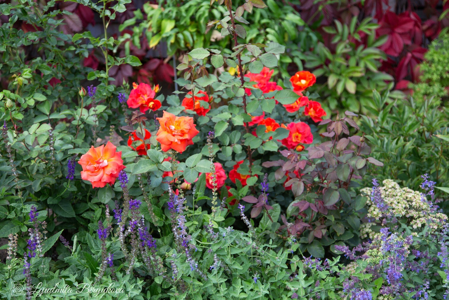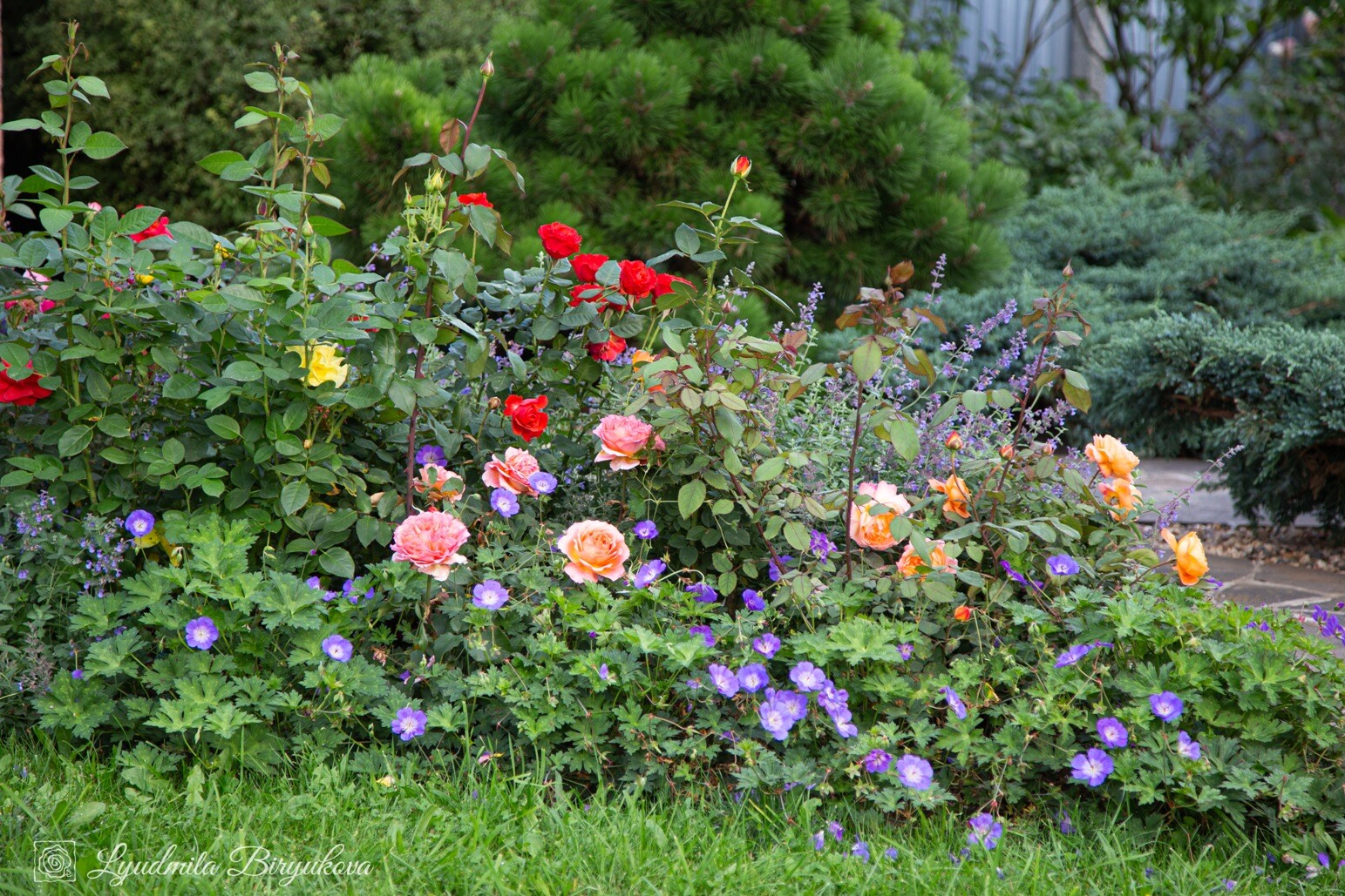 Мое аналитическое прошлое оказалась весьма полезным для структурирования и выполнения этой непростой задачи. Сперва все кустарники и розы были тщательно изучены, переписаны и рассортированы. В итоге был составлен проект цветника, с гармоничным распределением цветовых и объемных акцентов. Кустарники мы дополнили травянистыми многолетниками, объединив всю композицию с помощью цвета.