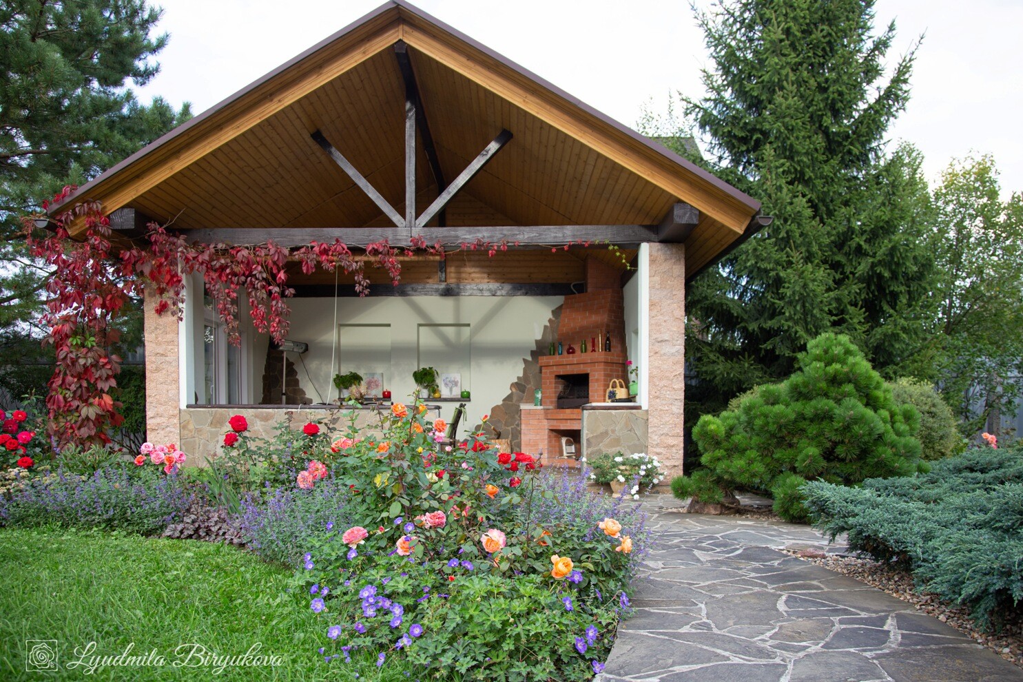 Работа проводилась осенью, но уже к середине следующего года все пересаженные растения полностью адаптировались, а многолетники набрали необходимый объем. Нам было очень приятно получать благодарность от хозяйки сада и разделять с ней радость от созерцания прекрасной живой картины. Интересно, что, работая на удаленке, хозяйка перенесла свой офис именно в беседку, и ее преображенный миксбордер создал прекрасный фон для видео встреч.