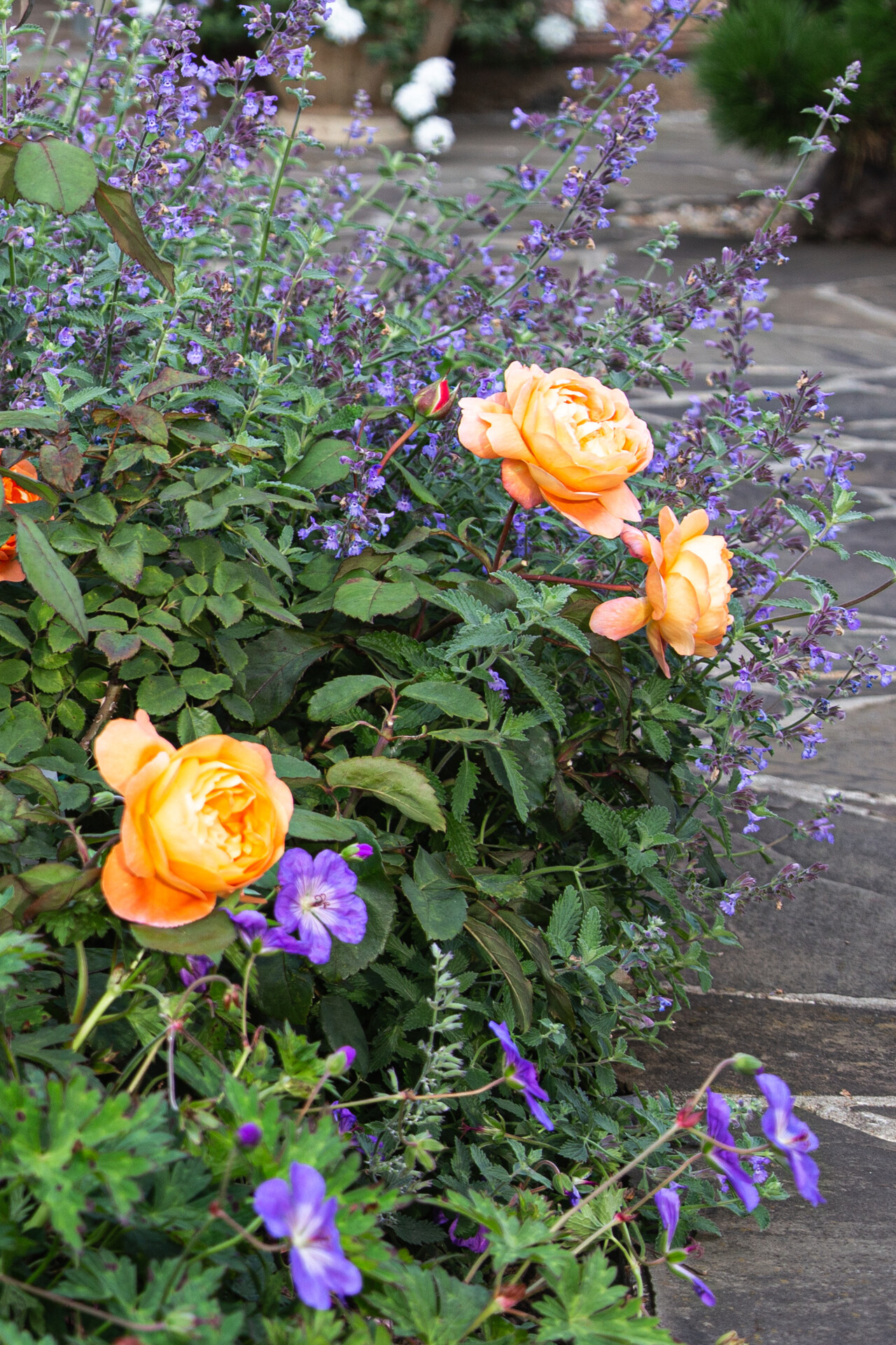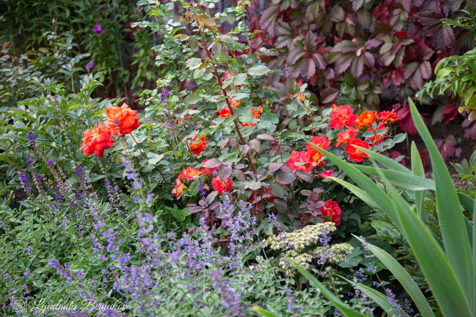 Мое банковское аналитическое прошлое оказалась очень полезным для структурирования и выполнения этой непростой задачи. Сперва все кустарники и розы были тщательно изучены, переписаны и рассортированы. В итоге был составлен проект цветника, с гармоничным распределением цветовых и объемных акцентов. Кустарники мы дополнили травянистыми многолетниками, объединив всю композицию с помощью цвета.