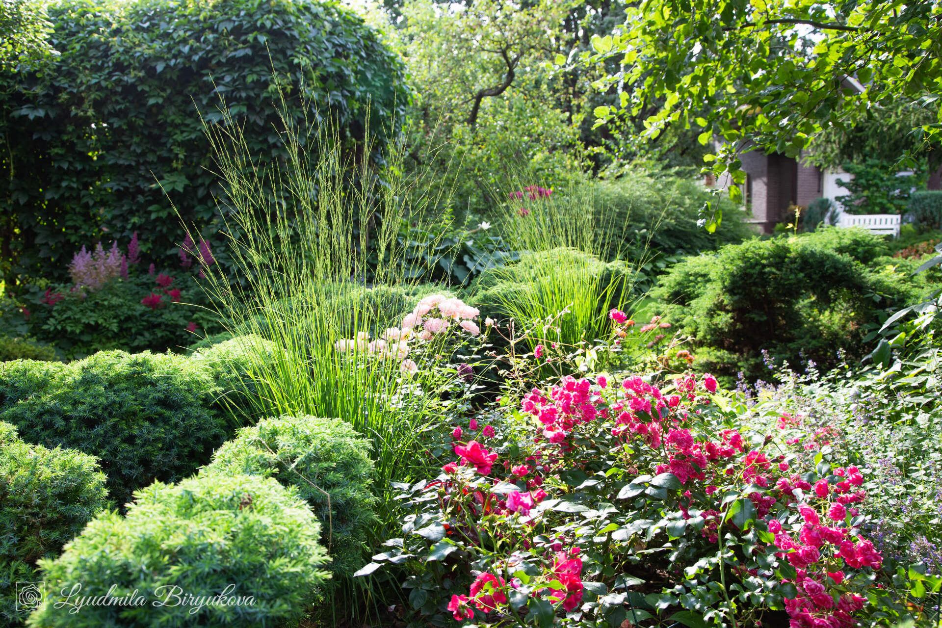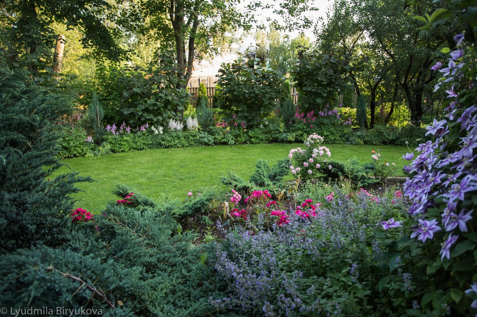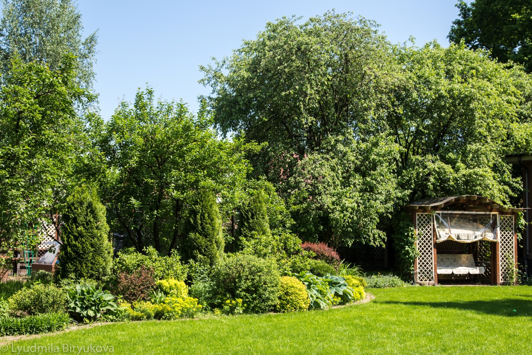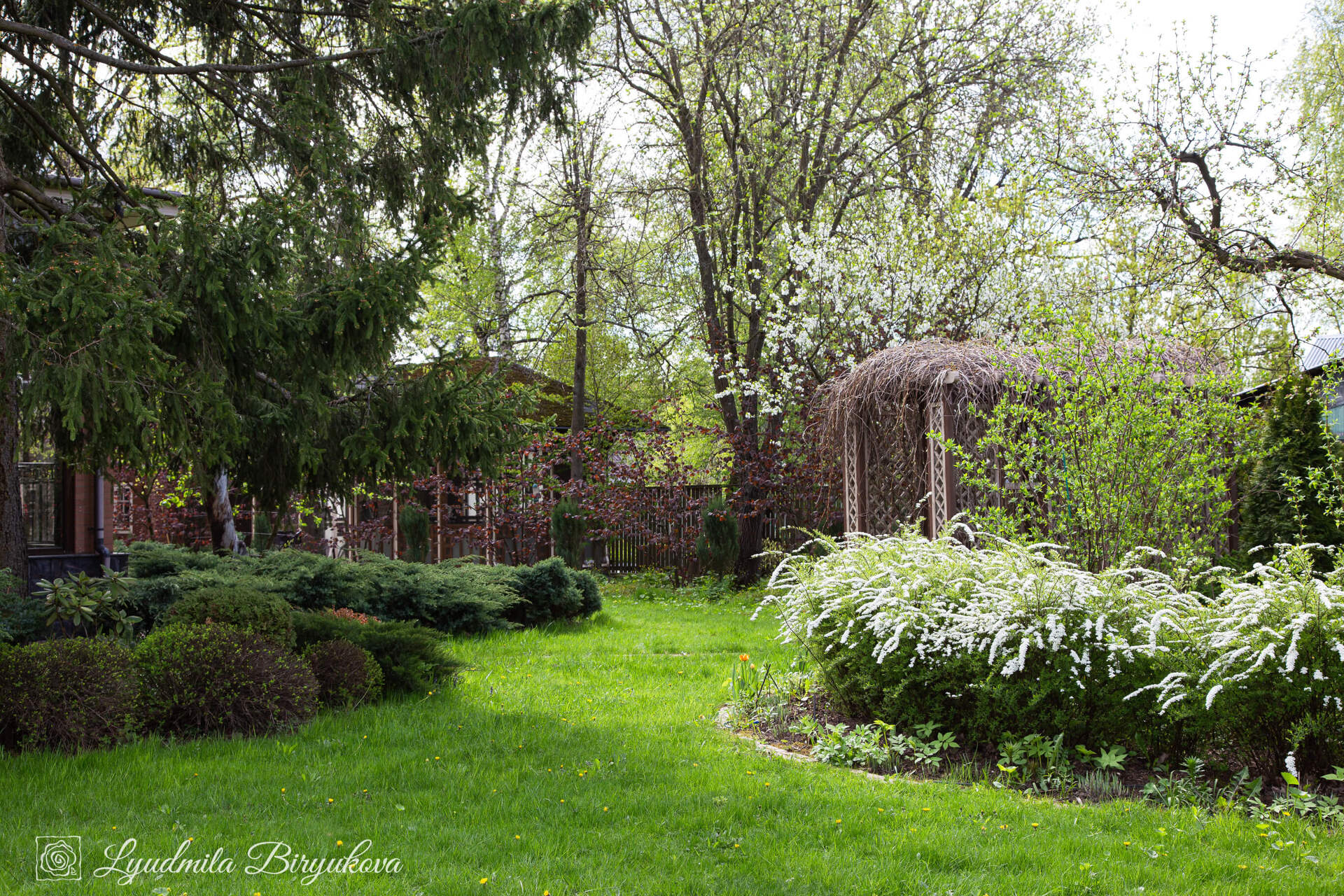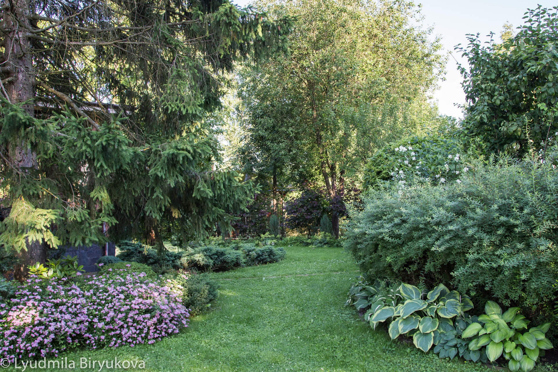 Этот сад, расположенный в стародачном поселке, создавался на участке с уже взрослыми лесными и плодовыми деревьями. Это было заброшенное и заросшее бурьяном место. В начале его освоения больные и недекоративные деревья и кустарники были удалены, а оставшиеся стали каркасом нового сада...