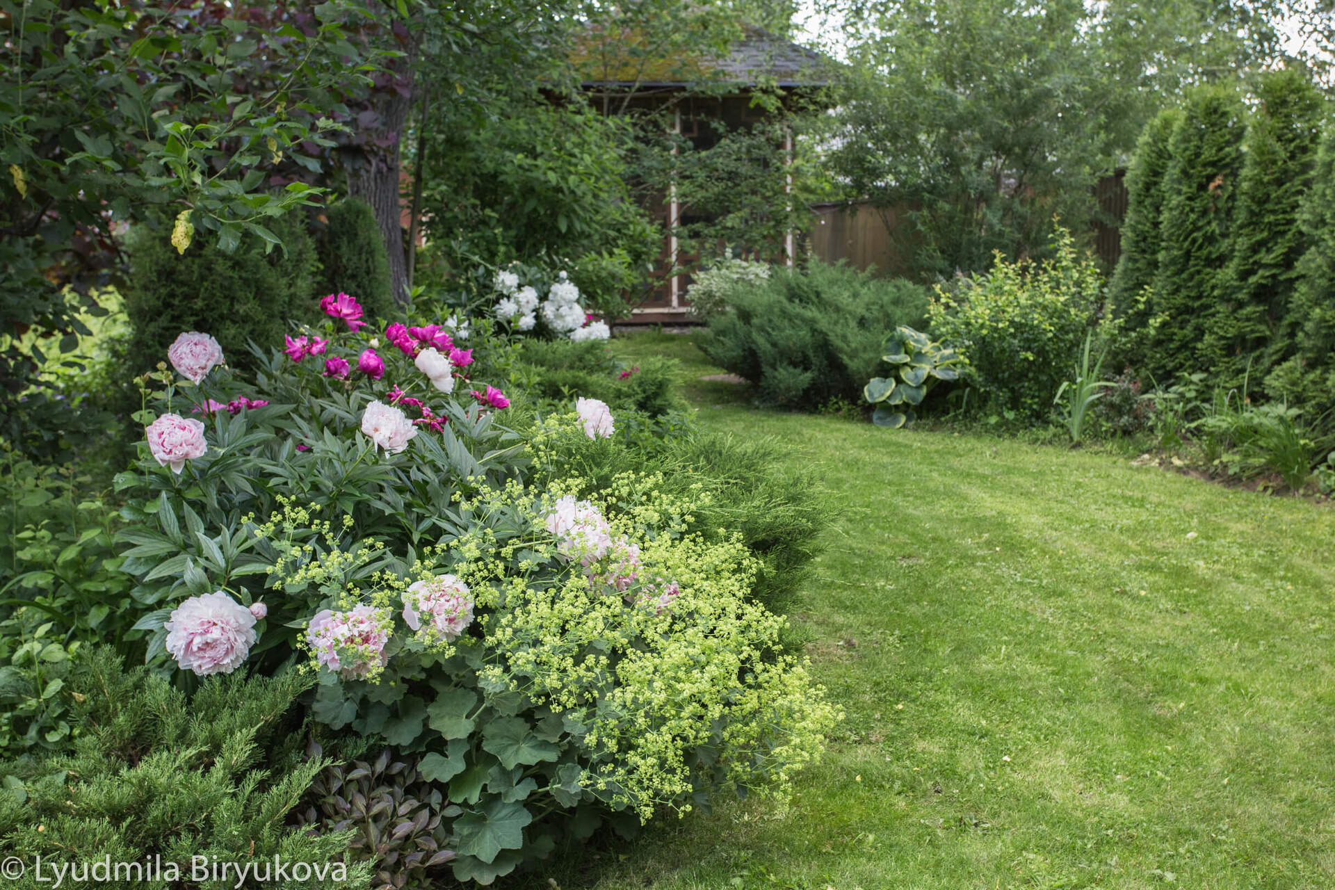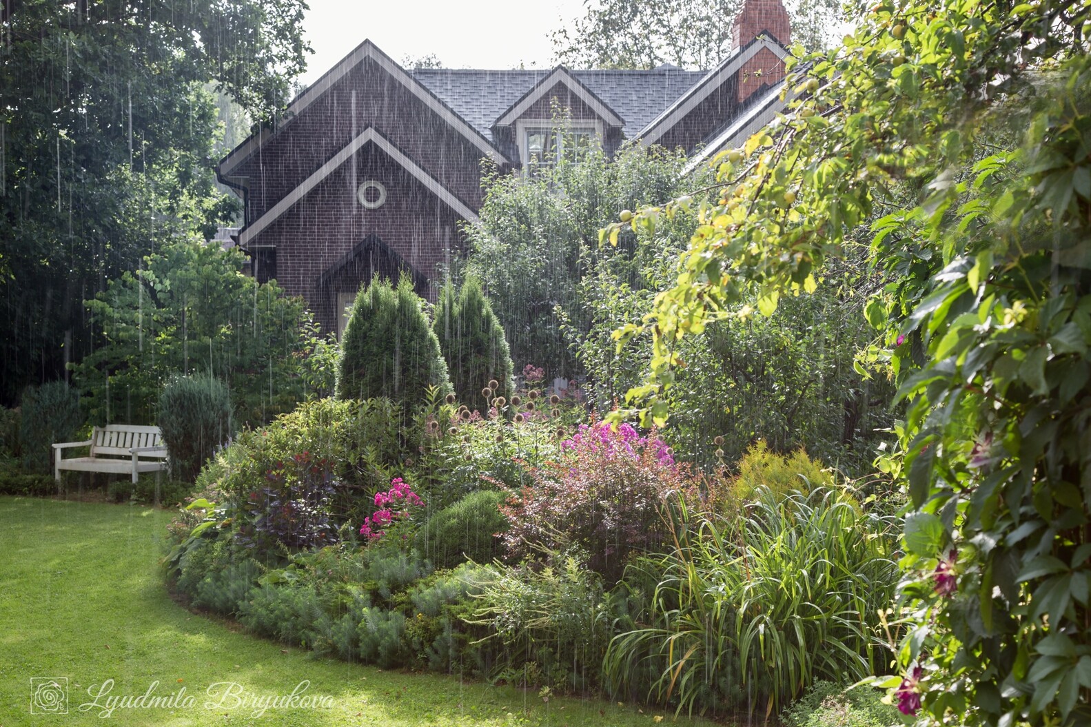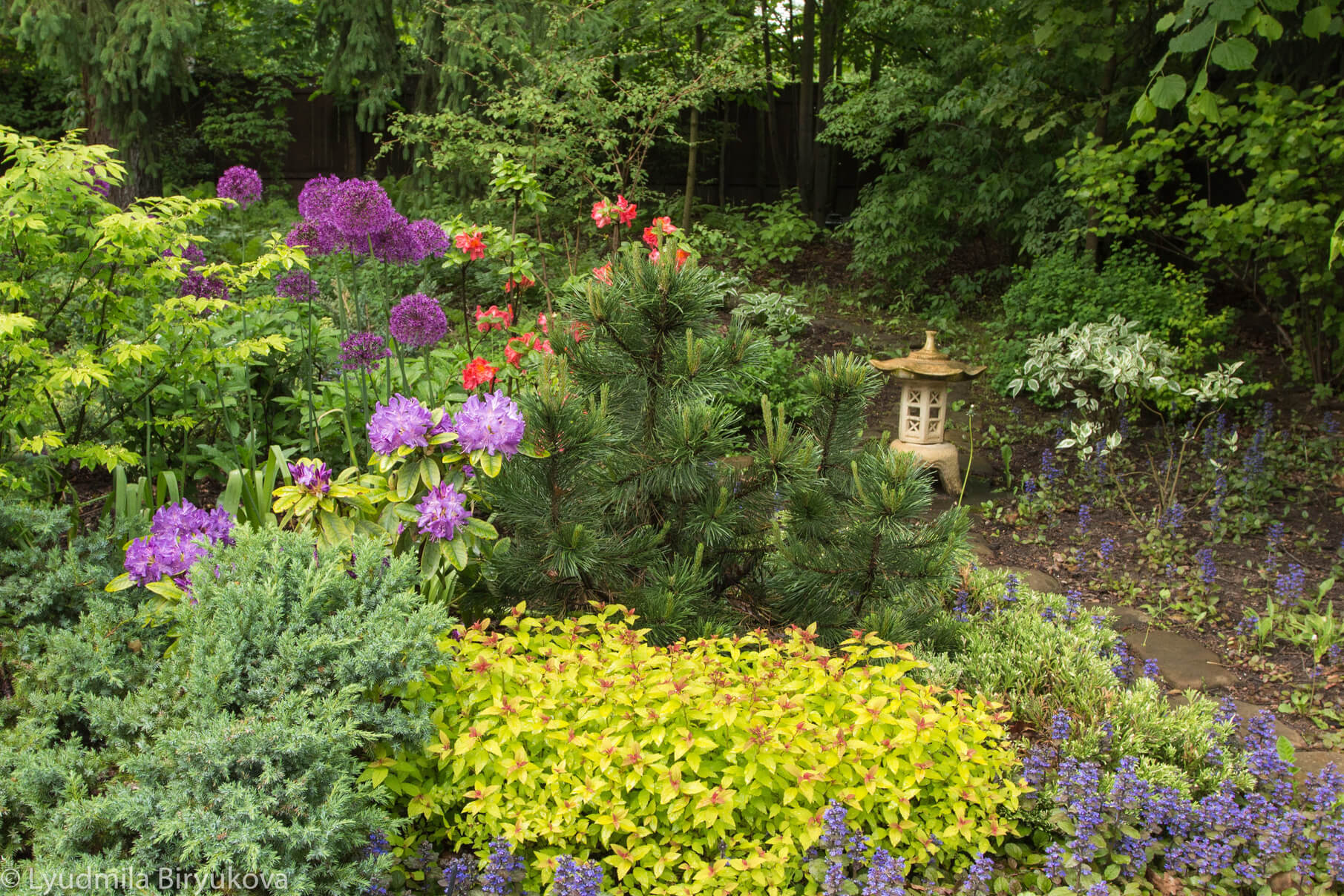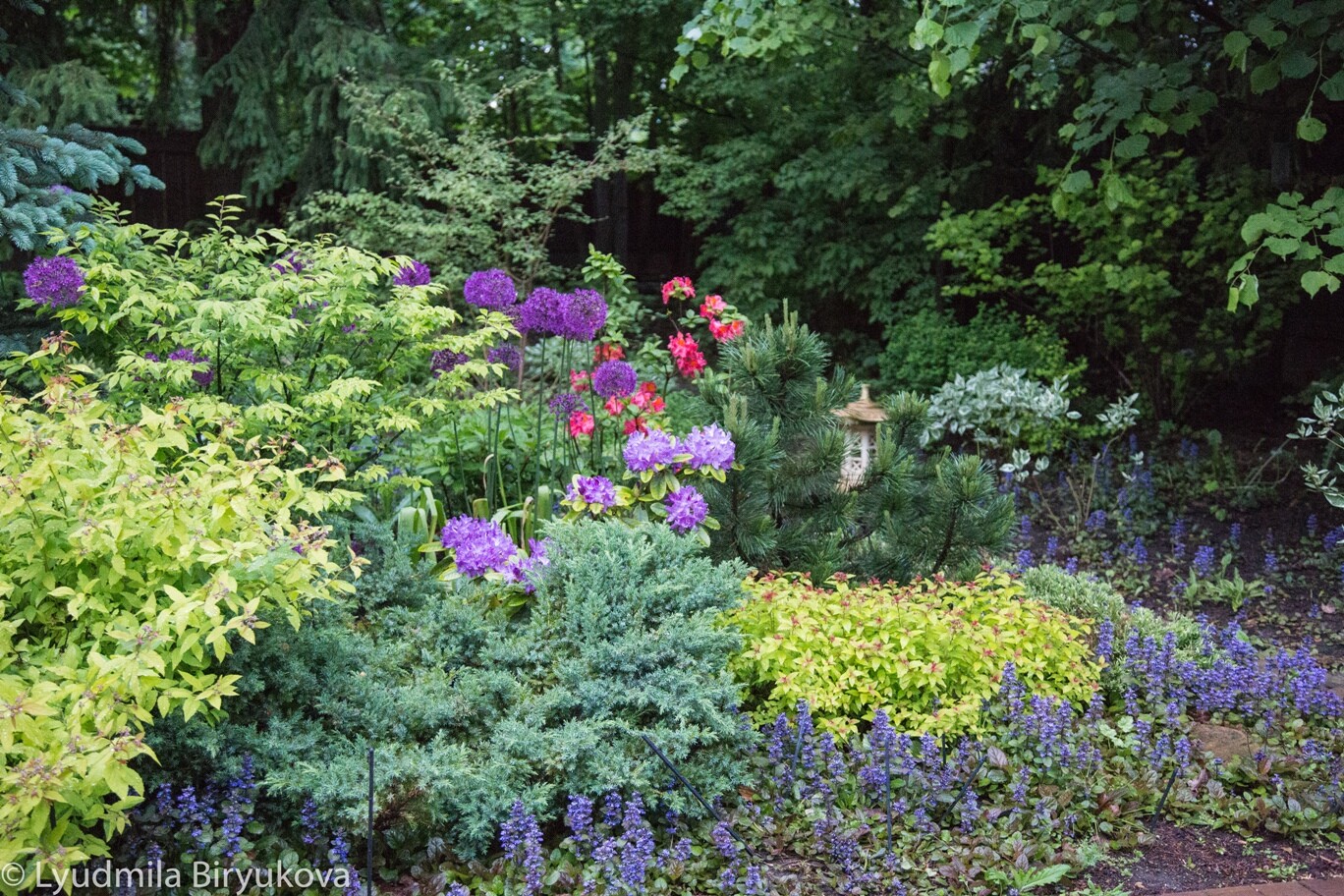 Этот сад, расположенный в стародачном поселке, создавался на участке с уже взрослыми лесными и плодовыми деревьями. Это было заброшенное и заросшее бурьяном место. В начале его освоения больные и недекоративные деревья и кустарники были удалены, а оставшиеся стали каркасом нового сада...