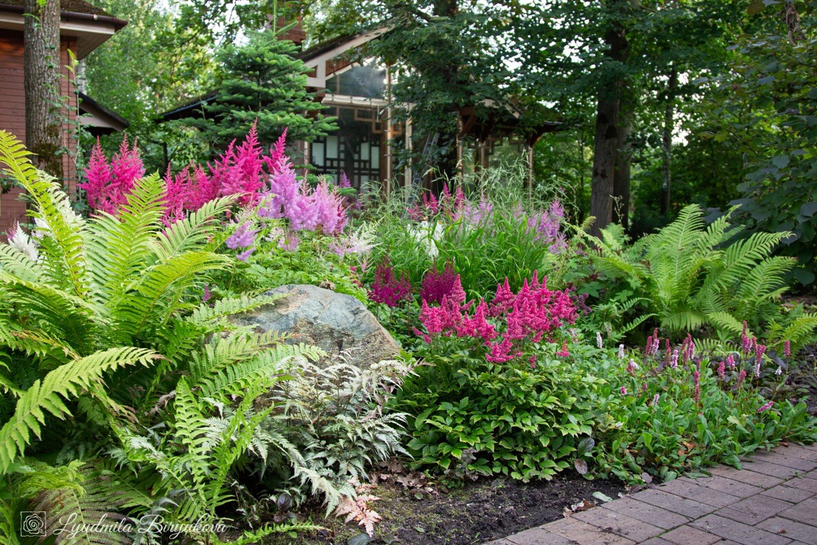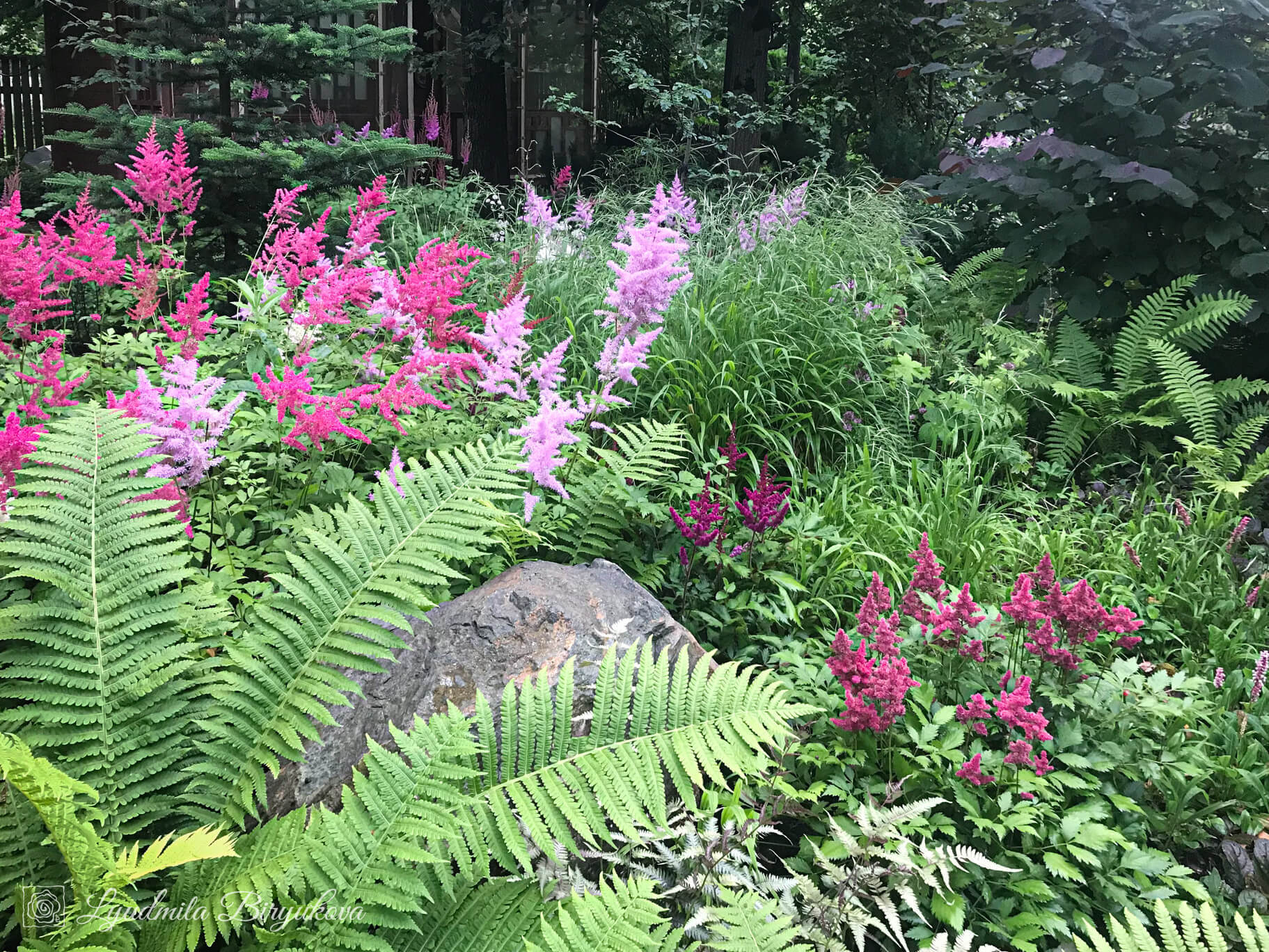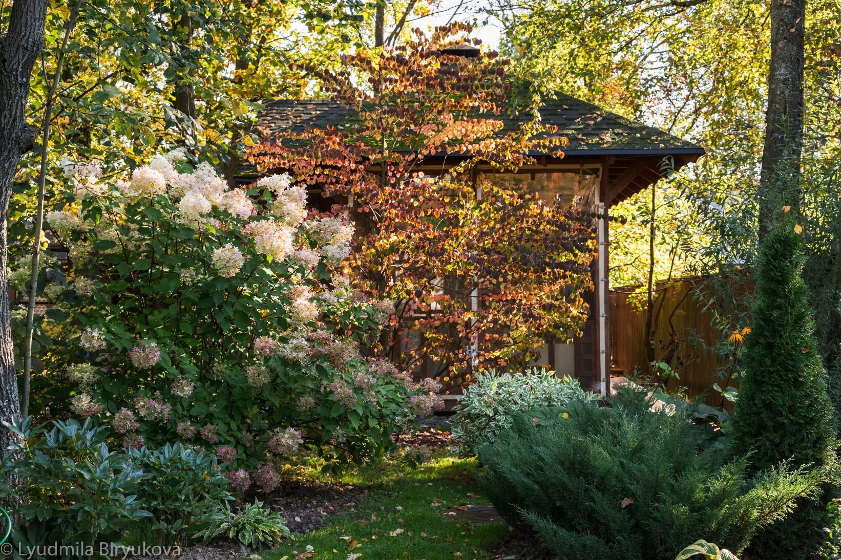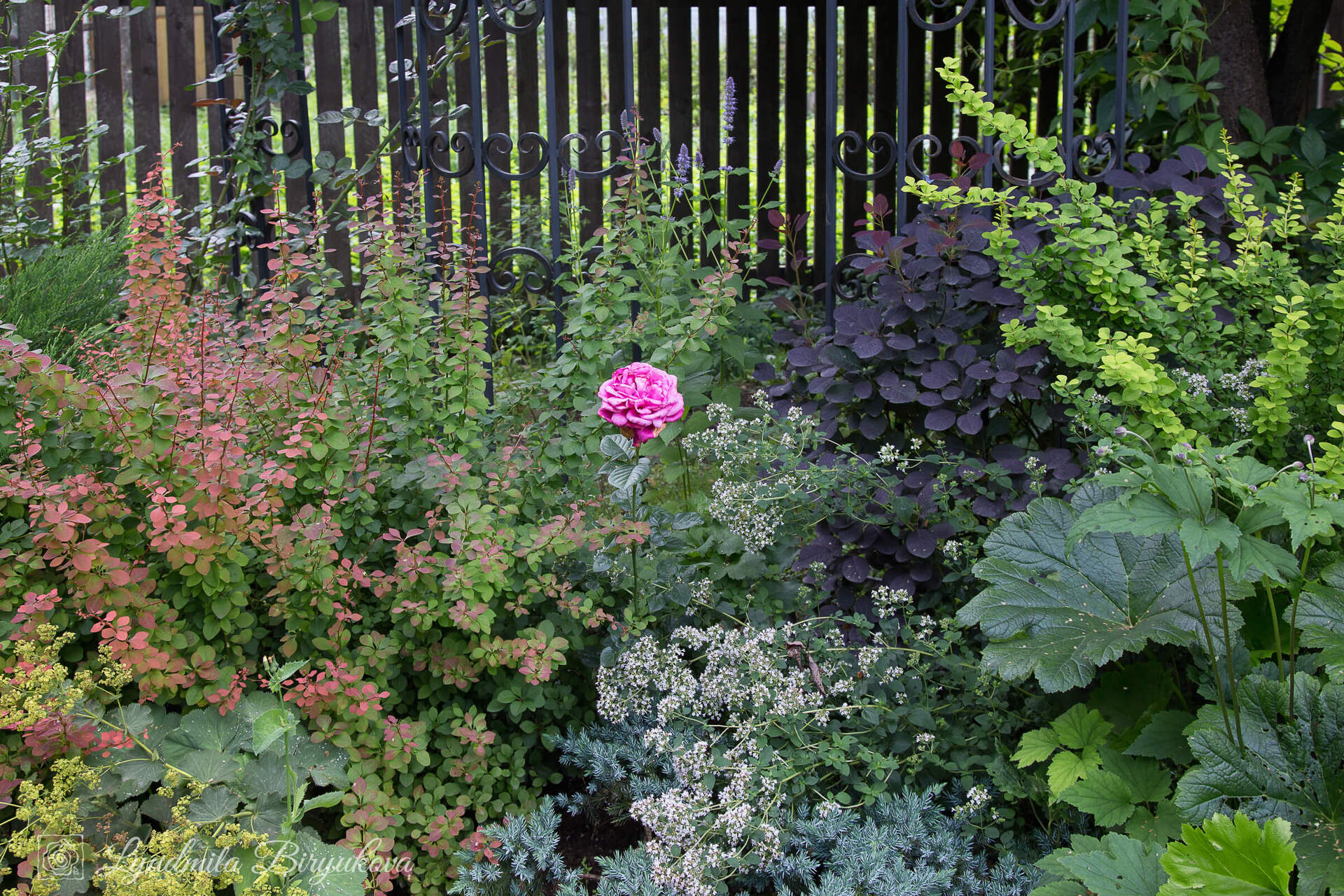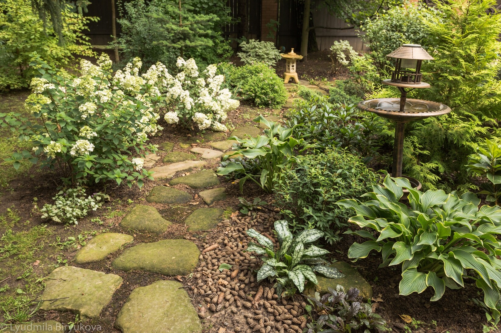 Этот сад, расположенный в стародачном поселке, создавался на участке с уже взрослыми лесными и плодовыми деревьями. Это было заброшенное и заросшее бурьяном место. В начале его освоения больные и недекоративные деревья и кустарники были удалены, а оставшиеся стали каркасом нового сада...